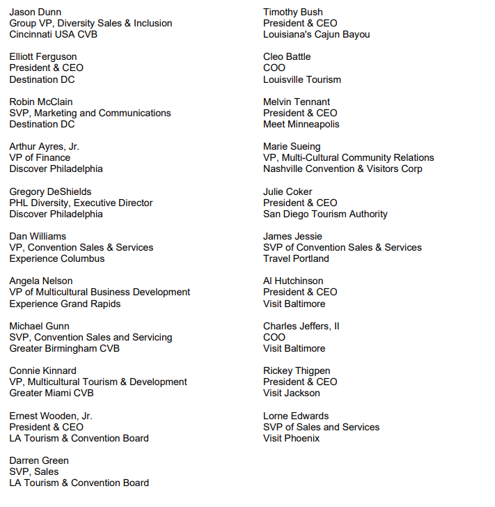 Like every Black person in this country, we well know that at any point in time in any city in America our rights as citizens and yes, our lives, could be taken in a moment at the hands of someone who sees themselves as superior and “in control.” Nationally, Blacks are denied equal access to job opportunities. In the hospitality industry, specifically destination marketing, our efforts to improve the representation of Blacks continues to be a challenge at all levels, but specifically at the executive and C-suite positions. We have watched the protests in our cities, and in the cities globally of our peers. We support the protests with the hope of change to a narrative we have lived with our entire lives.