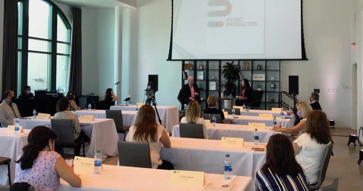 “Hybrid Meeting - Part 1: Reconnecting In-person, Inspiring Virtually” on Sept. 24 featured in-person hosts/speakers, 25 in-person attendees (the city’s current indoor gathering limit is 50) and 12 virtual attendees. The in-person attendees were asked to stay six feet apart, wear masks and wash their hands at the door (where temperature checks were conducted). A networking component wasn’t included, and preset seating was intended to help if any contact tracing is needed.