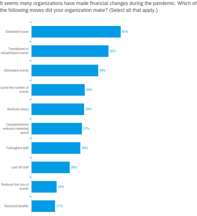 The most common cost-savings actions by industry organizations include Eliminating Travel (65%), Transitioning to Virtual/Hybrid Events (56%) and Eliminating Events (49%).