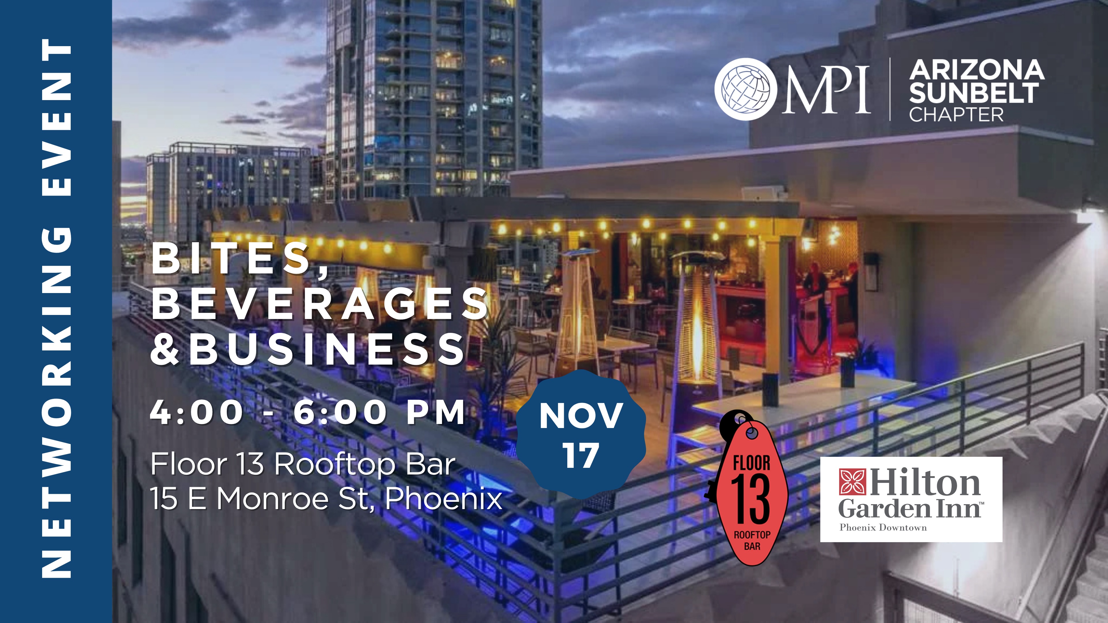 Welcome to the MPI AZ happy hour networking mixer on the Floor 13 Rooftop Bar! Grab a drink, enjoy the view, kick back, and get ready to connect with incredible people. You might be here to spark new friendships, chat about exciting projects, or simply enjoy the vibe. Whatever the reason, we hope you have an amazing time. Cheers! 🍻