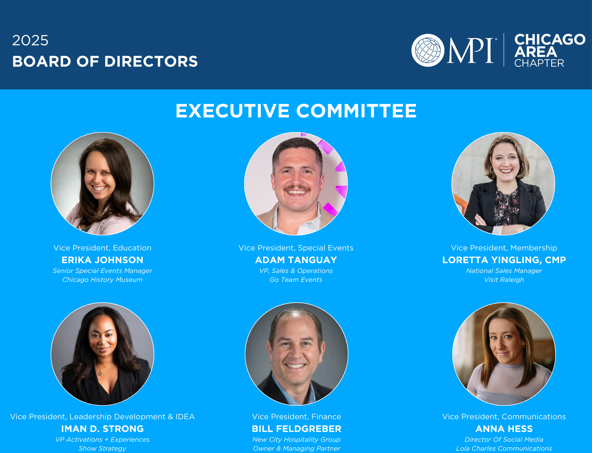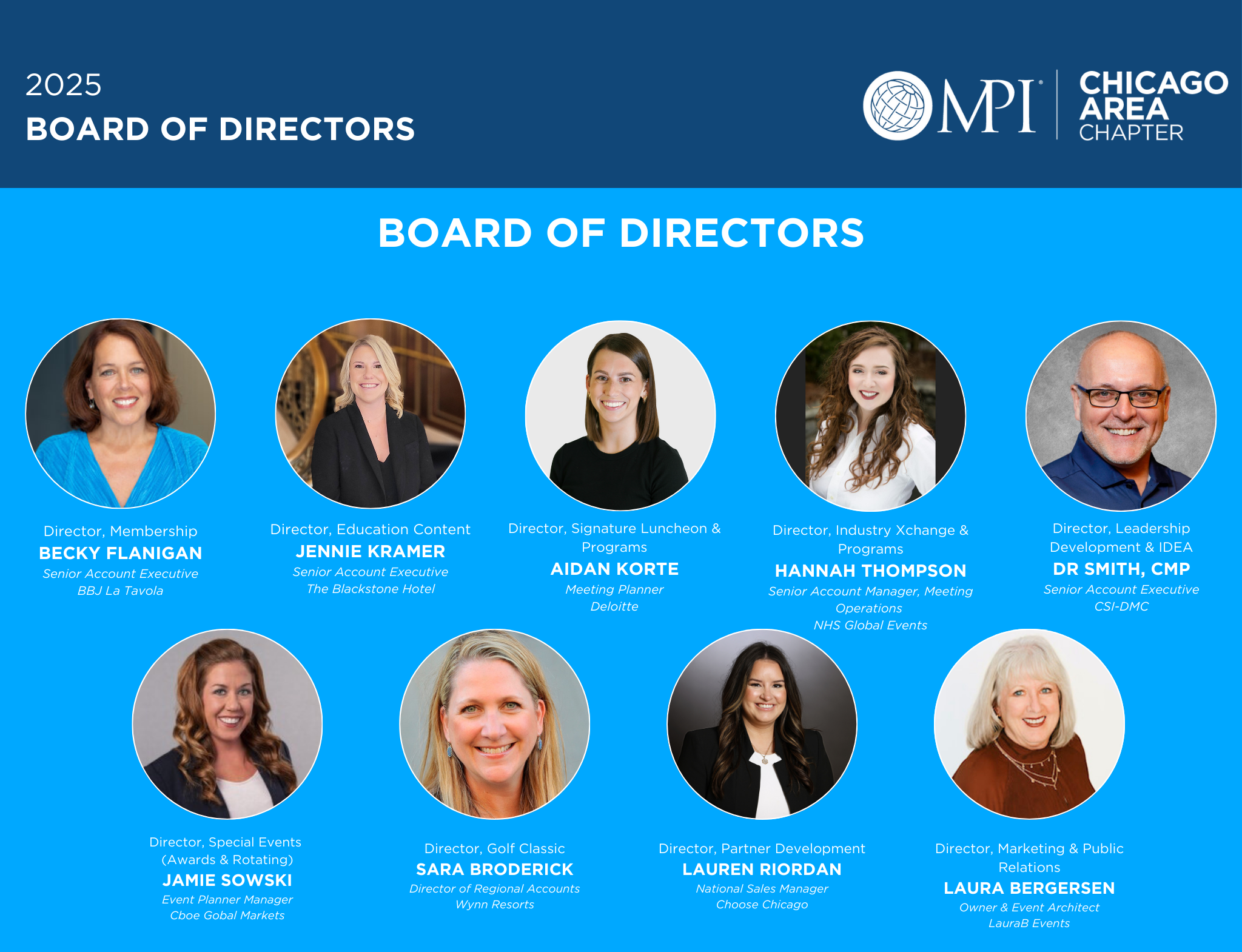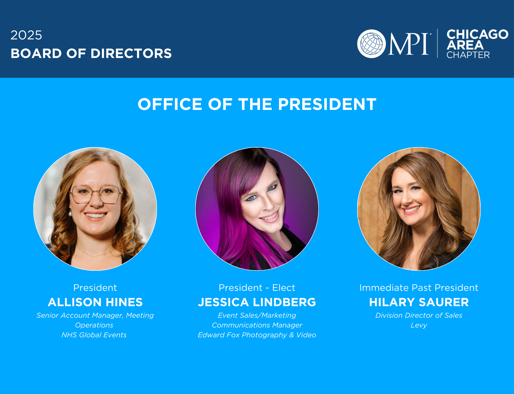 The MPI Chicago Area Chapter Nominating Committee has selected the following individuals, who we believe to have the skills, dedication and integrity to provide outstanding leadership to our chapter during their term in office. This slate was sent to the entire MPI-CAC membership on June 19, 2025 via email, and was approved by a unanimous vote after 30 days (July 19, 2025).
