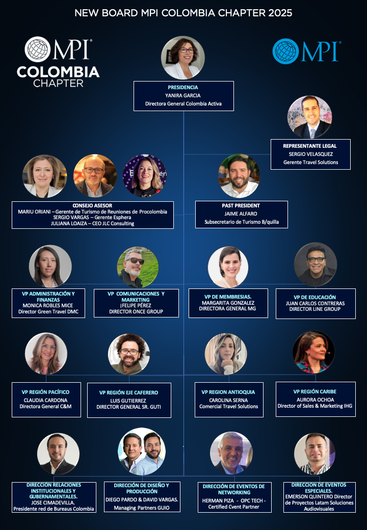 2025: Un Capítulo en Crecimiento y Reconocimiento Hoy, gracias al liderazgo y la dedicación de diversos profesionales, MPI Colombia cuenta con más de 50 miembros activos. Este crecimiento refleja cinco años de arduo trabajo, en los cuales hemos desarrollado iniciativas clave, construido alianzas estratégicas y promovido la profesionalización de la industria de reuniones en Colombia. Nuestra historia es un testimonio del impacto que puede lograrse a través de la colaboración, la visión y el compromiso.