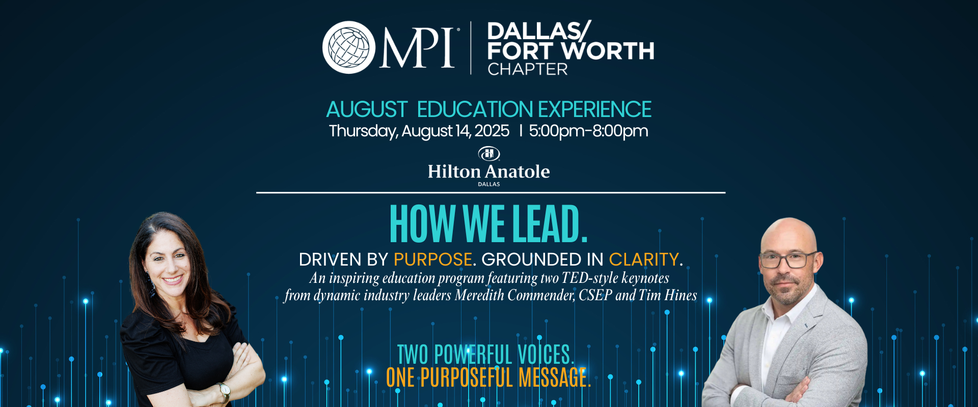 MPI DFW spotlights two powerful voices on what it means to lead with purpose. Whether you're managing a growing team, collaborating with diverse vendor partners, or navigating your own leadership journey, this session delivers actionable insights for professionals at every level. From introspective growth to entrepreneurial thinking, walk away with tools to lead with clarity, collaboration, and confidence.