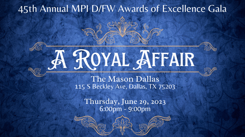 Join the MPI D/FW Chapter for a Royal Affair to commemorate our 45th Annual Awards of Excellence Gala & JPA Silent Auction. Located at The Mason Dallas, the historic 100-year-old lodge in Oak Cliff on Thursday, June 29, 2023, we will recognize industry leaders from our Dallas/Fort Worth Chapter.