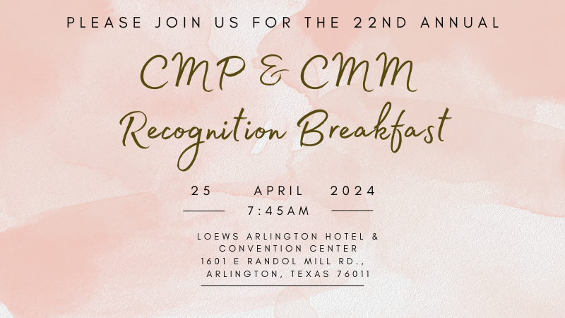 Please join us for the CMP & CMM Recognition Breakfast, where we celebrate your achievements as a dedicated professional in the industry. Your commitment to raising the standards of excellence and continuing education by earning your CMP and/or CMM designations is greatly appreciated and we look forward to honoring you.