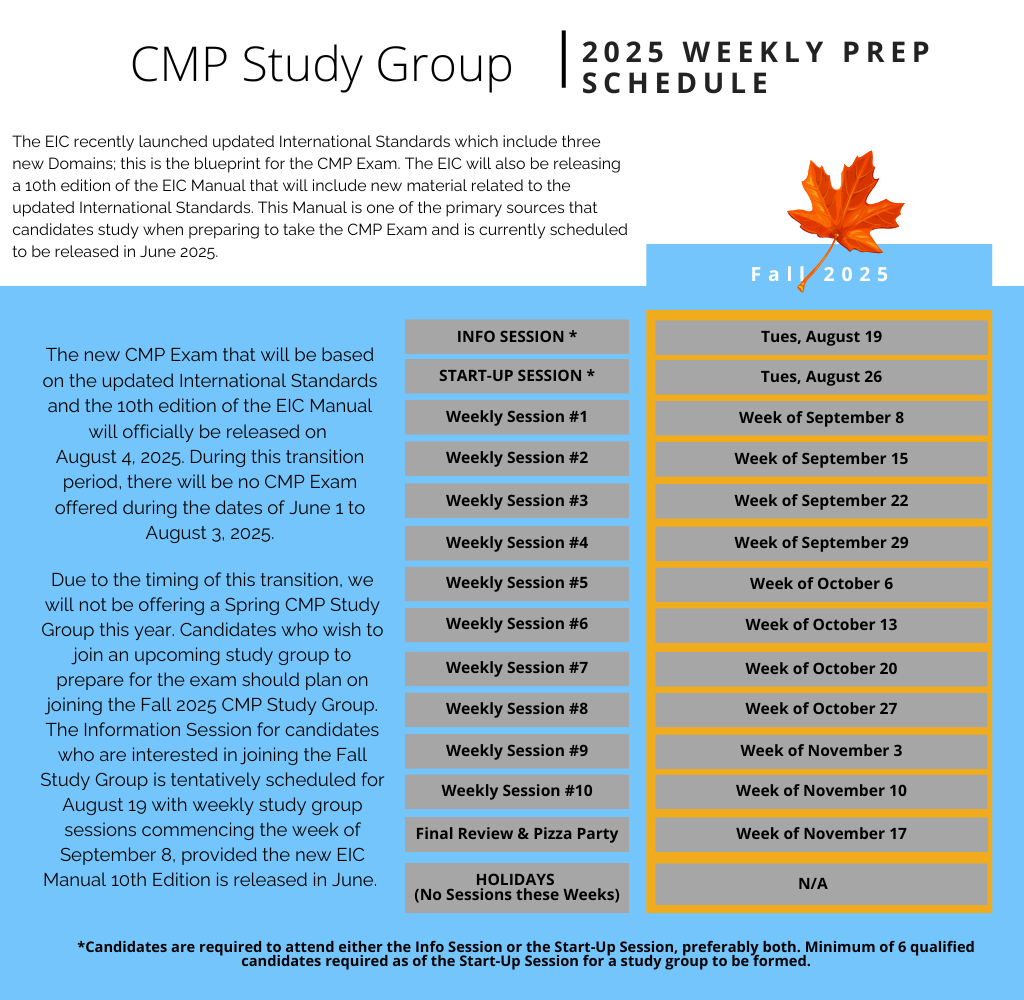 guide you through a review of the EIC's recommended study materials, give you structure and support as you prepare to take the CMP Exam, and connect you with a network of great industry colleagues as you work to attain this high level of excellence