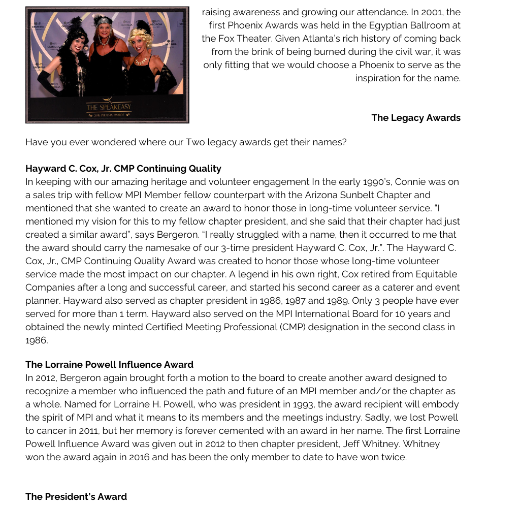 Description: Awarded to a long-standing member who has committed at least a decade of service to our association. This member strives to make our industry a strong force of education and personal achievement. Nominees for this award are chosen by the MPI Georgia Past Presidents Council.