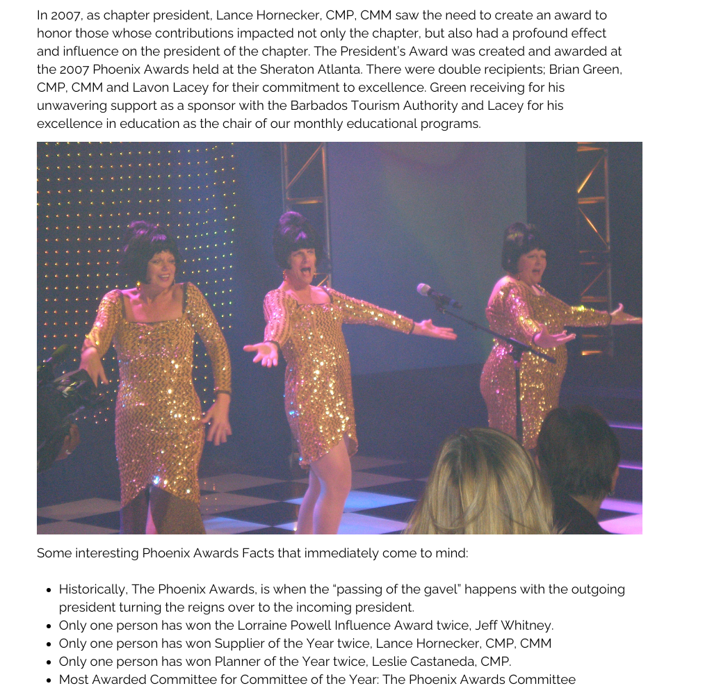 A huge thank you to our Premier Annual Sponsors: Atlanta CVB, Visit Raleigh, Topper Worldwide Transportation, PhotoSynthesis Studio; and to our 2017 Phoenix Awards Sponsors: Active Production and Design, A Divine Event, Atlanta Fever Entertainment, Atlanta History Center, BBJ Linen Rental, Be a Star Entertainment, Caesars Entertainment, Courtney Renee Jazz, Daytona Beach CVB, Discover DeKalb CVB, Embassy Suites by Hilton Atlanta Buckhead, Fuse Graphics, Georgia World Congress Center Authority, Greater Birmingham CVB, Greene Worldwide Transportation, Hilton Atlanta, Jekyll Island Georgia, L.E.D Experience Design, Loews Hotels, Louisville CVB, Modern Luxury, Peachtree Tents & Events, Tulip Blooming Creations, We Rent Atlanta, and the World of Coca-Cola!