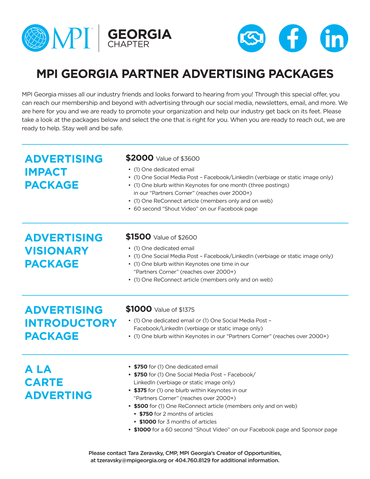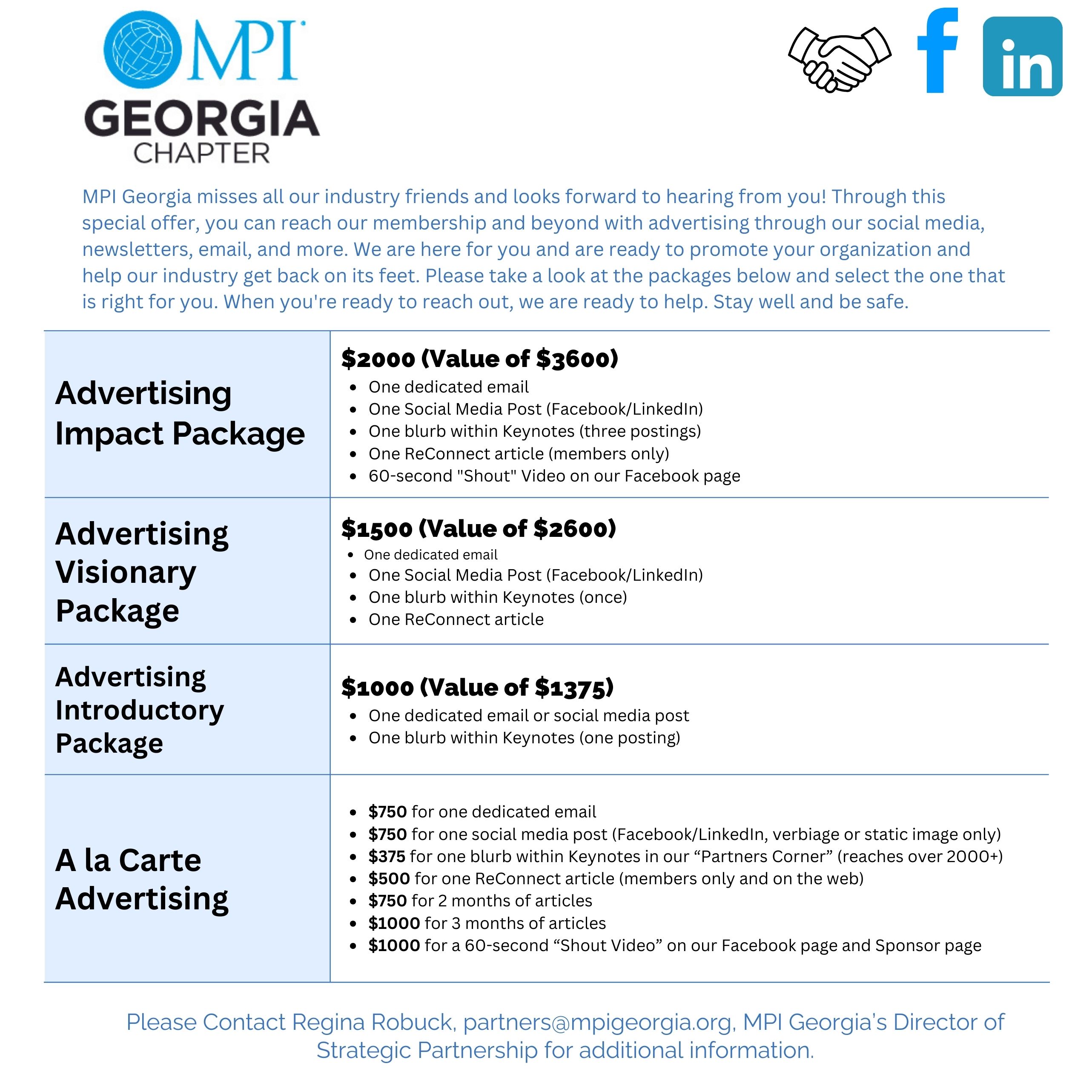 For more information about advertising opportunities with the MPI Georgia Chapter, please contact Tara Zeravsky at tzeravsky@mpigeorgia.org.