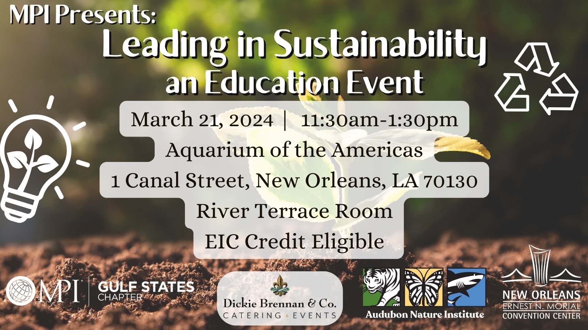 We are fortunate to have a most effective leader in the field of Sustainability as our speaker for this month’s Education event. Join us for this lunch session during which Linda Baynham, Director of Sustainability and Corporate Social Responsibility at the Morial Convention Center, will address their efforts in recycling, food distribution, and CSR impacting our local event community.