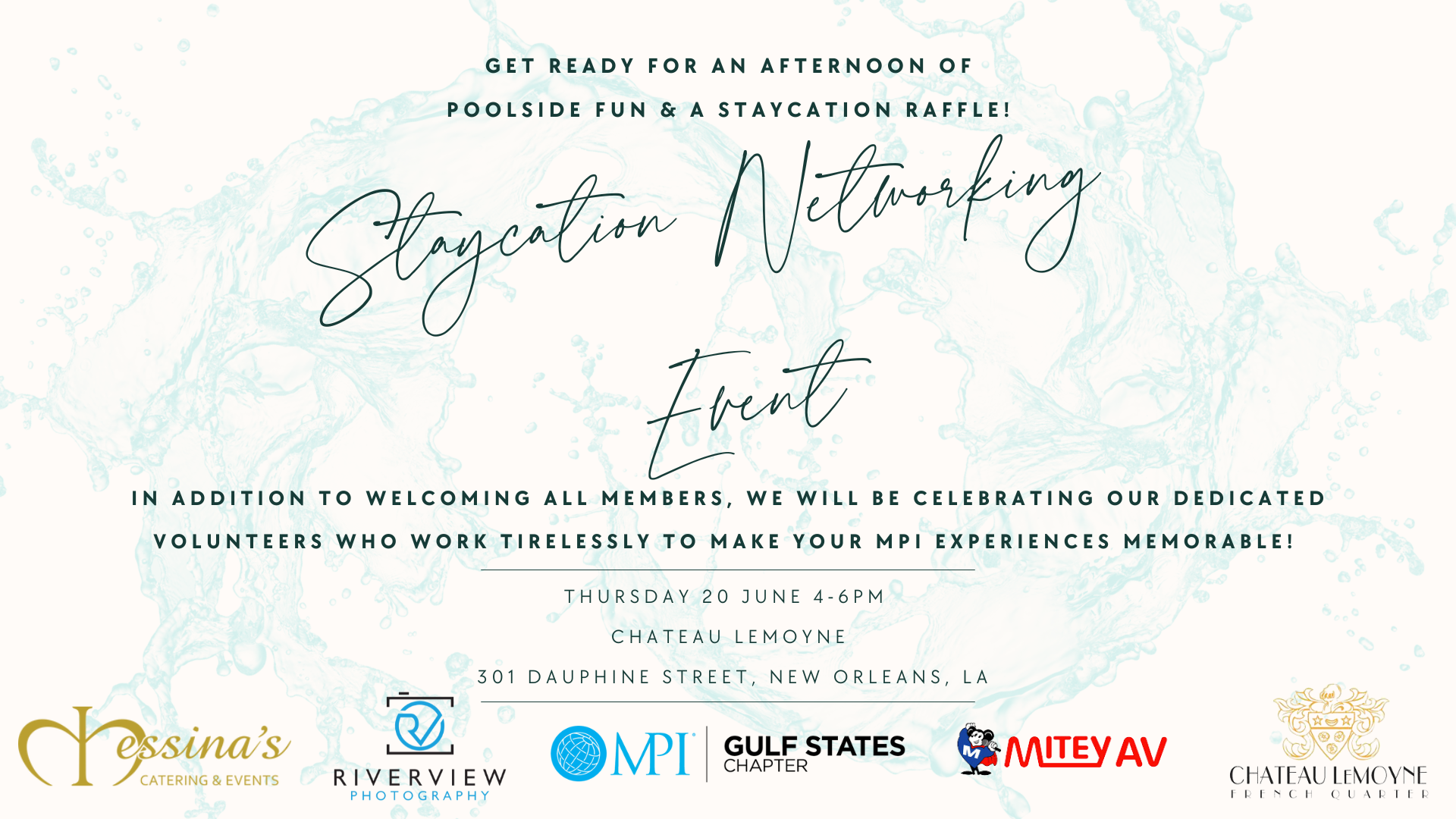 Join us in June at MPIGS Staycation Networking Event for a unique and rejuvenating experience that combines the best of relaxation, adventure, and local exploration.  June’s Networking event is designed to help you unwind, recharge, and rediscover the beauty of your own city.  Join us for a staycation like no other!