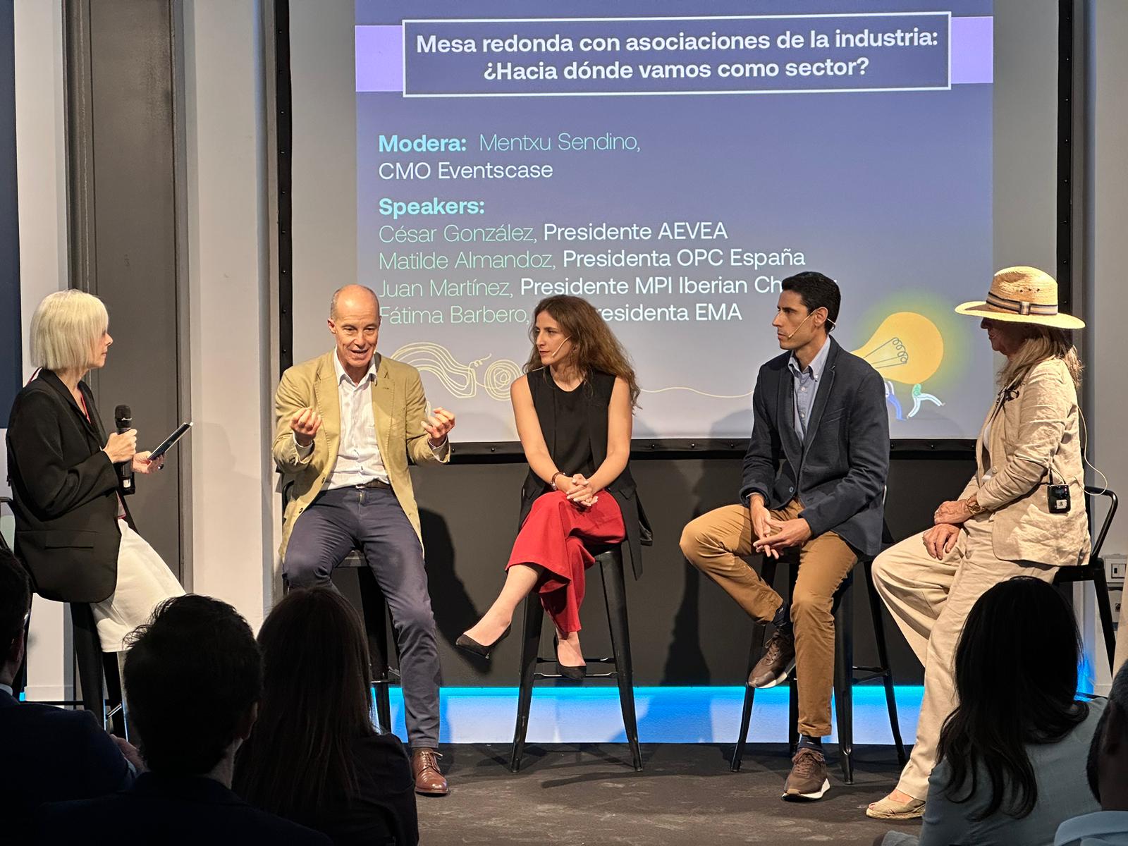 Las asociaciones de la industria de los eventos estuvieron representadas en la Mesa Redonda: “¿Hacia dónde vamos como sector?”. Matilde Almandoz, Presidenta de OPC España y del Foro MICE; Fátima Barbero, Vicepresidenta de EMA; César González, Presidente de AEVEA y Juan Martínez, Presidente de MPI Iberian Chapter, repasaron los retos a los que se enfrenta el sector, haciendo una especial mención a la gestión de talento.
