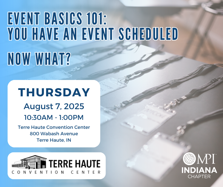 Join the MPI Indiana Chapter on August 7 at the Terre Haute Convention Center for an engaging session, "Event Basics 101: You Have an Event Scheduled. Now What?" This informative panel discussion features expert panelists Erica Shonkwiler, Emilie Perkins, and Hilary Wickes, who will share valuable insights into the next steps after scheduling an event. Come prepared with your questions and experiences for a collaborative and interactive session!