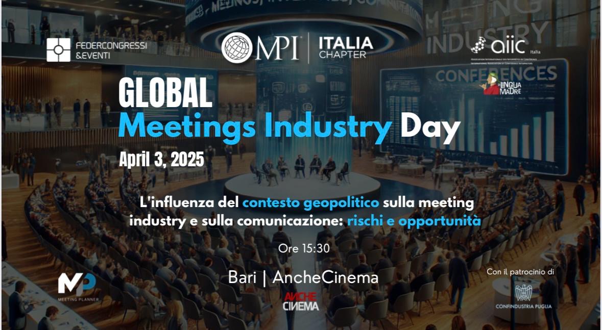 MPI Italia Chapter, in collaborazione con AIIC - The International Association of Conference Interpreters - Associazione Internazionale Interpreti di Conferenza, Federcongressi&eventi e Meeting Planner, organizza un importante momento di confronto tra professionisti del settore eventi e comunicazione, alla presenza di rappresentanti istituzionali e con il patrocinio di Confindustria Puglia.