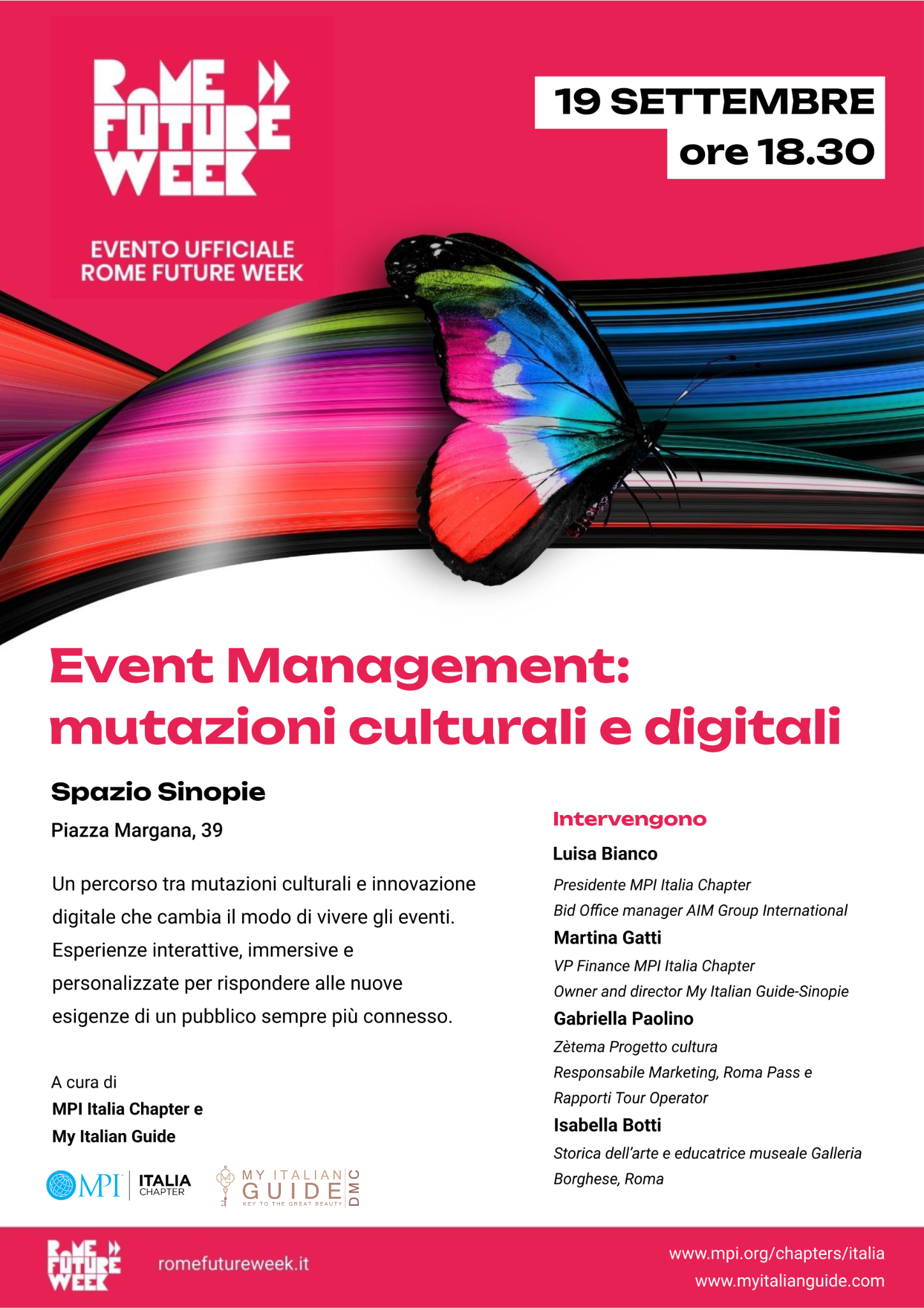 MPI Italia Chapter e My Italian Guide promuovono un confronto aperto su questi temi, presentando nuovi modelli di esperienza digitale e strumenti innovativi da integrare nella meeting industry. L’obiettivo è rispondere alle esigenze di un pubblico sempre più esigente e tecnologicamente preparato, offrendo spunti concreti per progettare eventi che siano davvero tailor made e innovativi.
