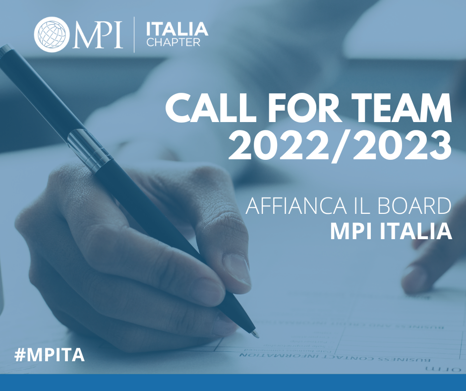 Il Board MPI Italia Chapter 2022/2023 apre nuovamente le sue porte e lancia una Call 4 Team per raccogliere nuove candidature spontanee e/o ricandidature per affiancare i vari VP con un supporto concreto, operativo, a titolo volontario e motivato, da parte dei soci del capitolo italiano Planner, Supplier o Student.