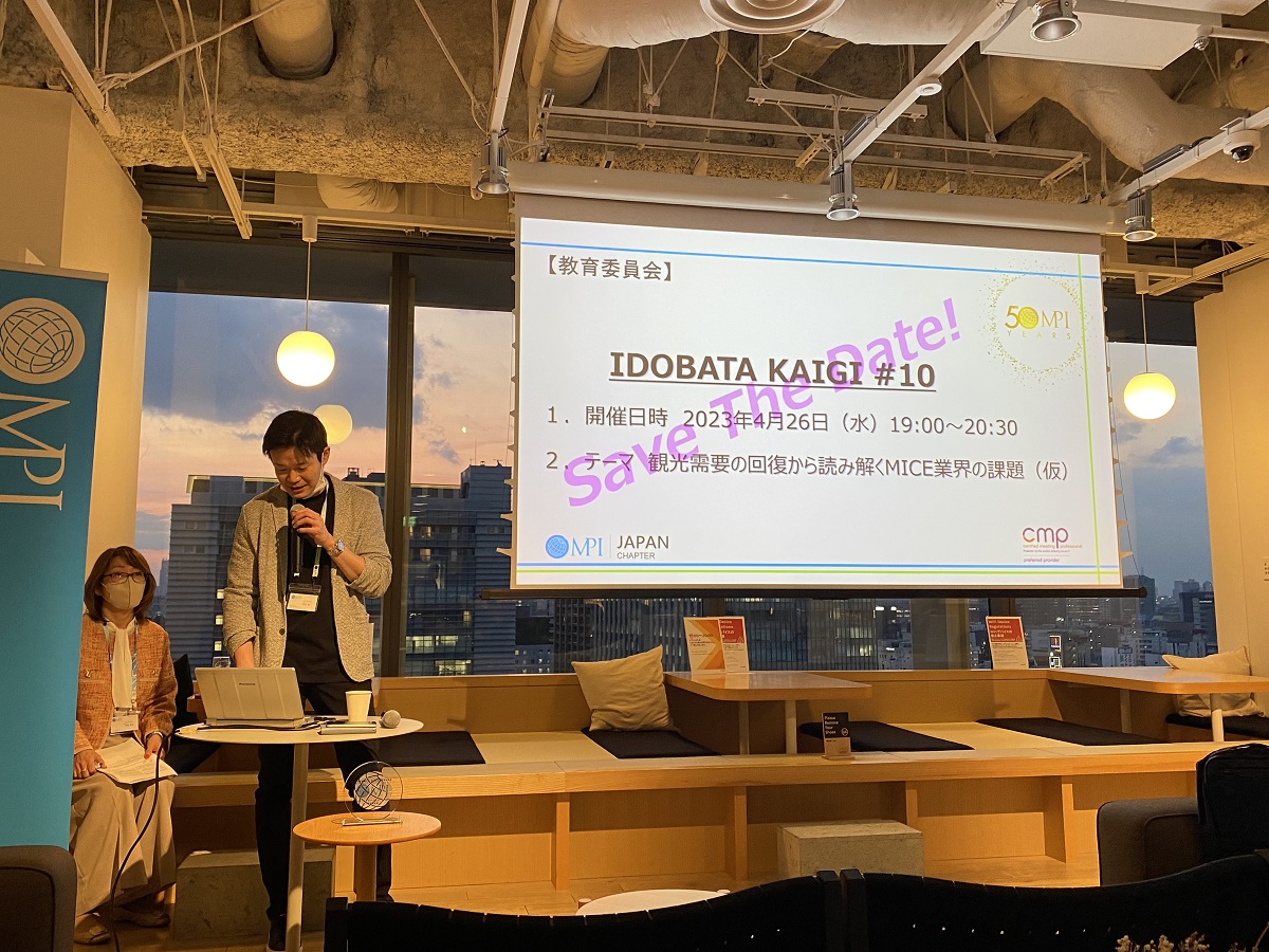 イベントでは、冒頭に岡村篤MPI Japan Chapter 会長(野村総合研究所 社会システムコンサルティング部 産業インフラグループマネージャー)が活動報告として、GMID2023の1Day特別企画として実施したメンバーシップの割引制度を利用して入会した新会員を紹介しました。また、4月26日に「観光需要の回復から読み解くMICE業界の課題」をテーマに開催予定のIDOBATA KAIGI#10についても紹介しました。保坂恵子MPI Japan Chapter前会長(株式会社クニエ マーケティング部)は、MPI本部からJapan Chapterが受賞したチャプターアワードについて報告しました。