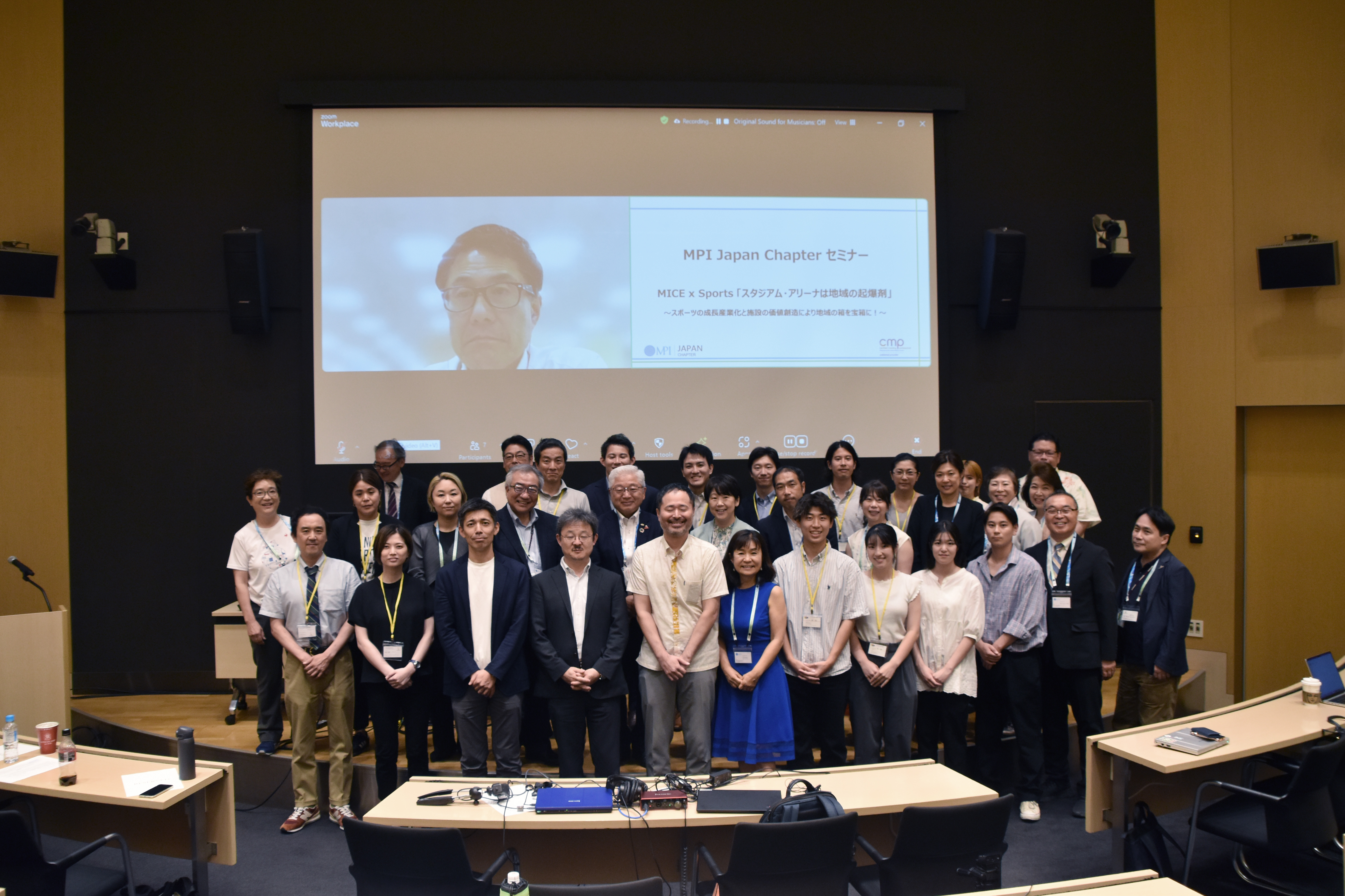 ディスカッションでは、パネリストに桃井参事官のほか、沖縄アリーナ株式会社取締役施設運営部長の片野竜三氏、トヨタアルバルク東京株式会社アリーナプランニング部長の林洋輔氏を迎え、MPI日本支部教育担当役員の田中正之会員がモデレーターを務めました。