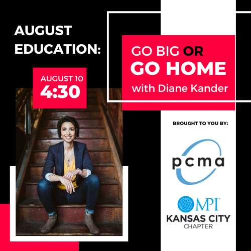 The MPI KC Chapter is thrilled to join forces with PCMA Heartland Chapter in welcoming Diana Kander as our speaker for August’s Education Program. Diana is planning an interactive session relating to her new book. “Go Big or Go Home” is the greatest collection of the most memorable pitches in film, sports, business, and philanthropy. These stories come from individuals and organizations that decided to Go Big or Go Home because their deals were too important to fail. One day, you’ll have a pitch that matters just as much. And when you do, you can follow the tools outlined in this session to plan for the future and create an experience that will close the deal.