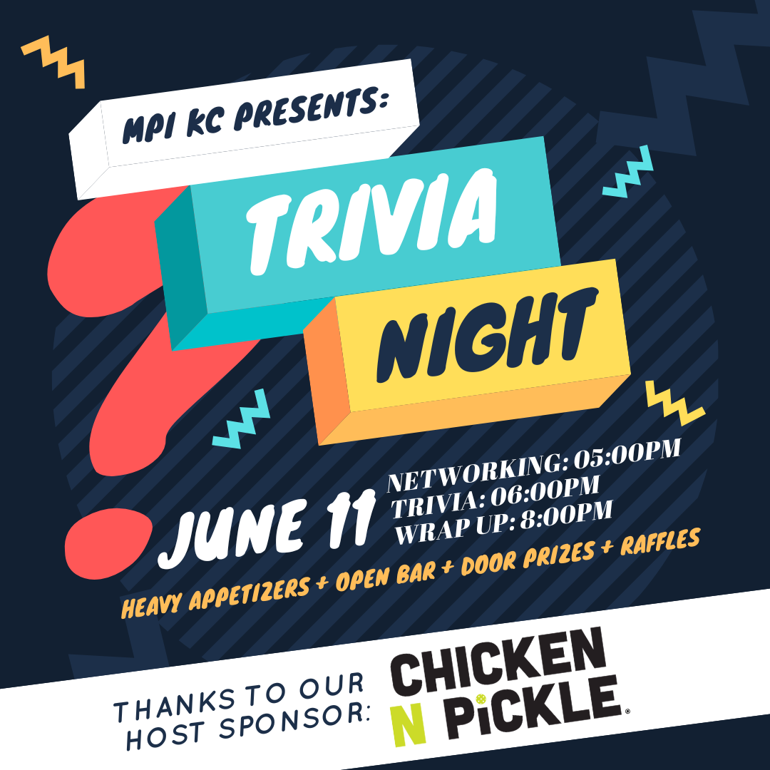 Come join us for another great night of Trivia at Chicken N Pickle Overland Park. Put your teams together and join us for some industry bonding, then test your knowledge and prepare your bragging rights with a few rounds of Trivia. Teams (themes and costumes strongly encouraged) can be made up of 6-8 people and can be registered individually or as a team. Prizes will be awarded to the winning TRIVIA team as well as a Crowd favorite (best costume/theme), door prizes, raffles and more. CNP will have a heavy appetizers and an OPEN BAR so come hungry, thirsty and ready to have fun!