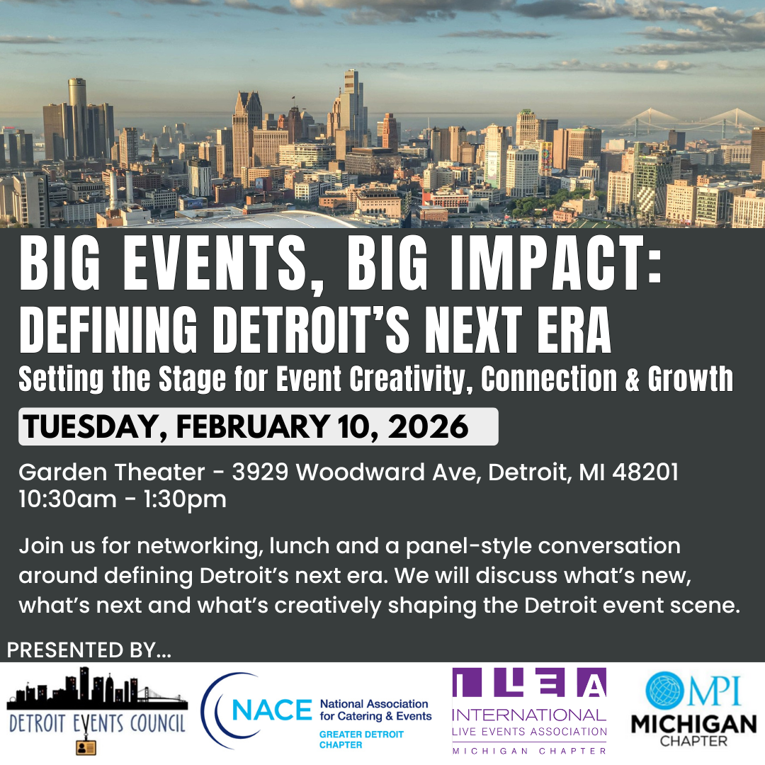 Don't miss the 4th annual Big Events, Big Impact Luncheon presented by ILEA Michigan, NACE Detroit, MPI Michigan and the Detroit Events Council.