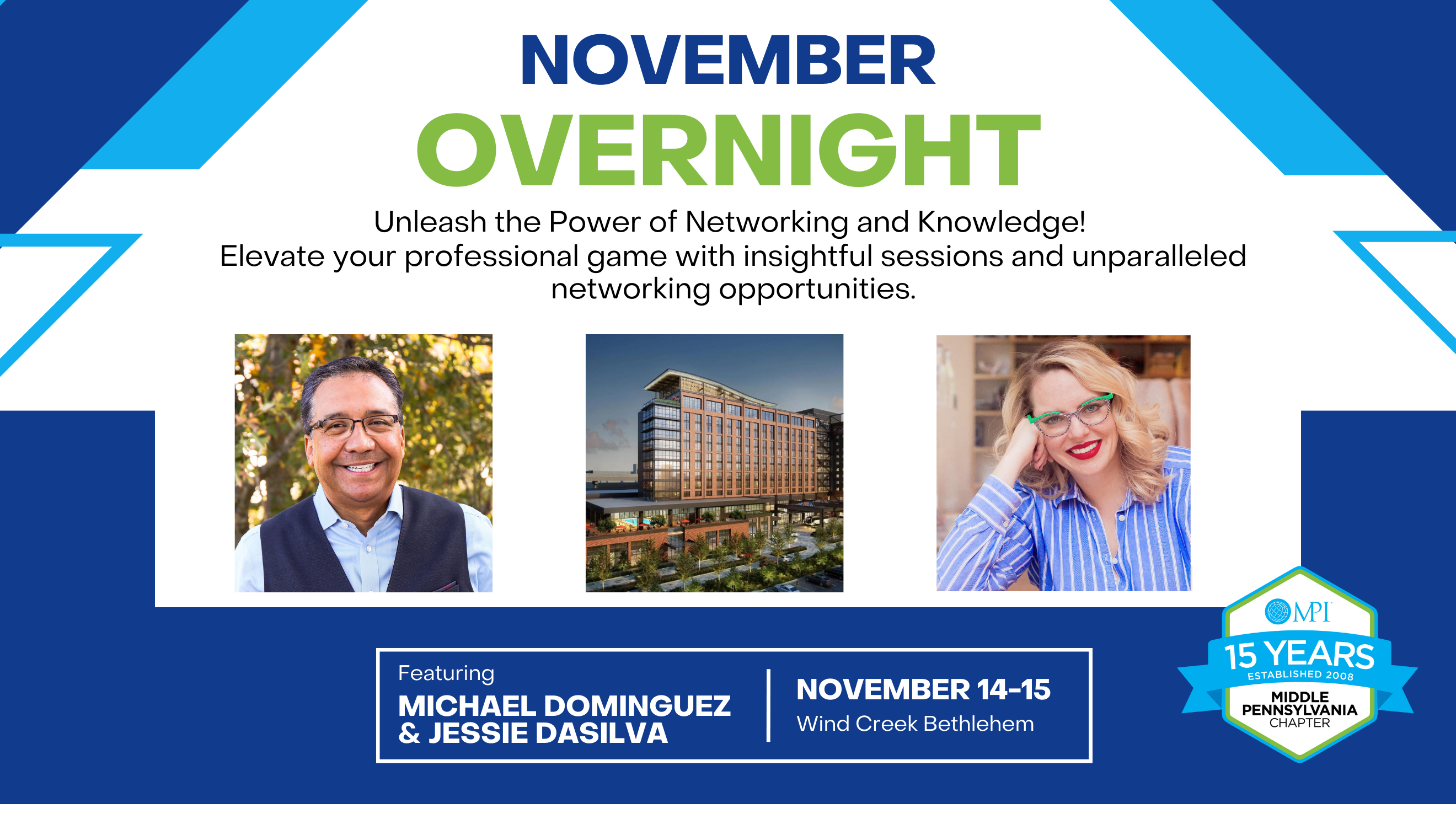 The first 10 MPI Middle PA MEMBER Meeting Planners to contact Cindy Conaway at mpimiddlepa@outlook.com to reserve your complimentary overnight room. You must register for the event first.