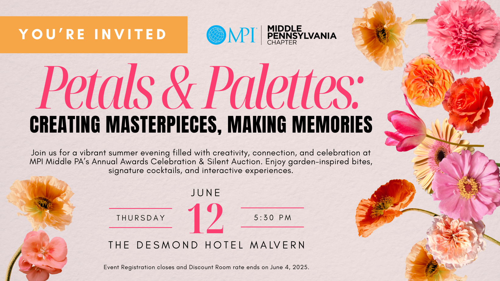 Join us for a vibrant summer evening filled with creativity, connection, and celebration Petals & Palettes: Creating Masterpieces, Making Memories—at the MPI Middle PA Annual Awards Celebration & Silent Auction on Thursday, June 12 at The Desmond Hotel Malvern. πΈπ¨