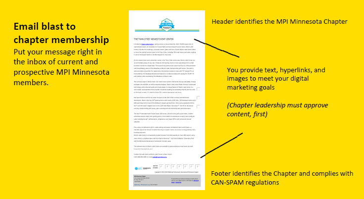 Email Blast to Chapter MembershipPut your message right in the inbox of MPI Minnesota Chapter members! Your message (once approved by chapter leadership) will be distributed by the chapter to its membership.