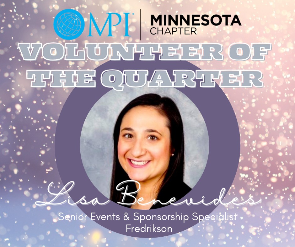 Congratulations to our MPI Volunteer of the Quarter Lisa Benevides. Lisa moved from her native New York to Minneapolis in 2019. She spent some time working at a downtown hotel before the pandemic shut everything down. In 2021, Lisa joined Fredrickson and Byron. Since most of her first years in Minneapolis were spent in lock down, she looked for a great way to connect with industry professionals in the area and decided to join MPI. It didn’t take Lisa long to realize that volunteering would be the best way to connect and interact with fellow event experts.