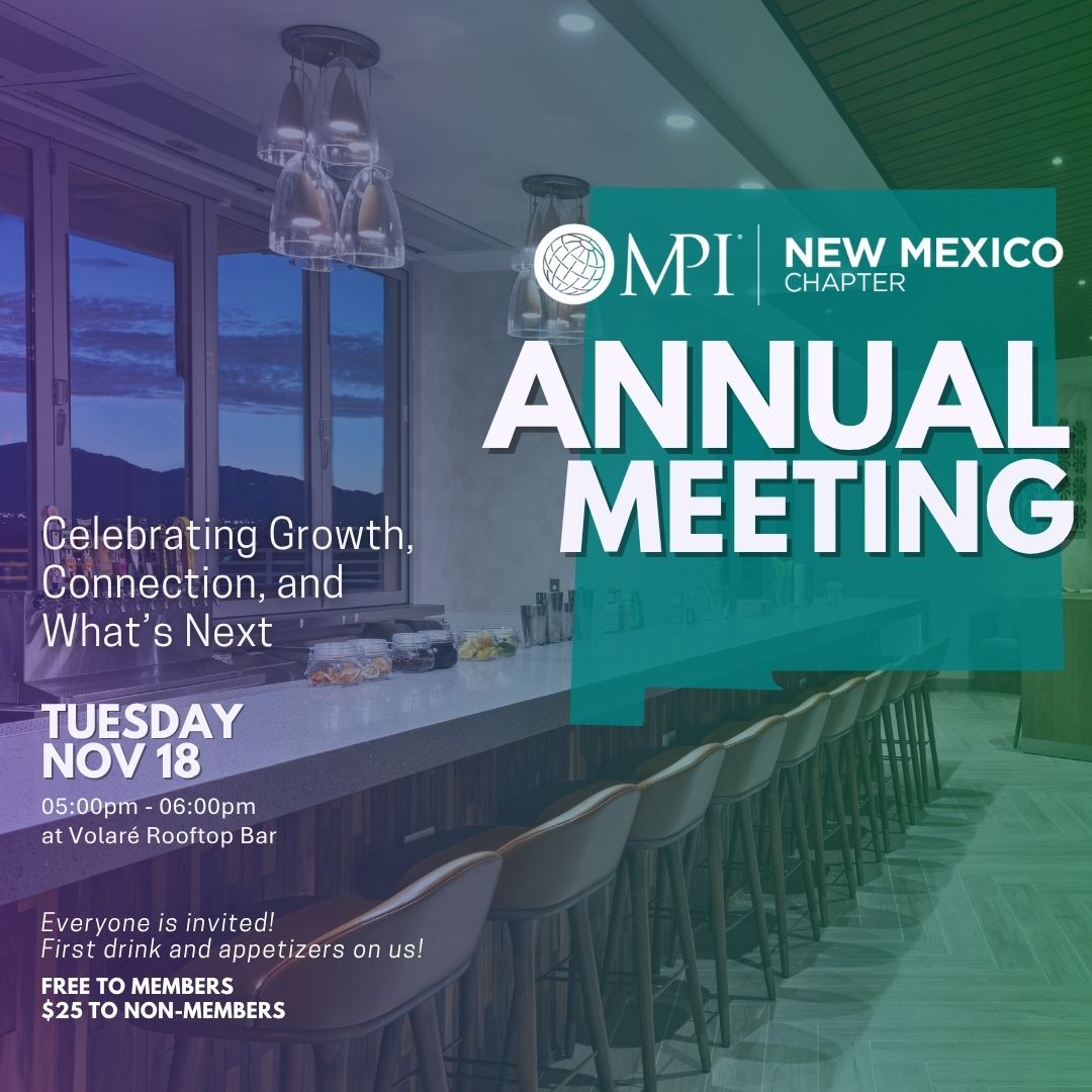 Join MPI New Mexico on November 18, 2025 from 5 PM to 6 PM for our Annual Meeting. We’ll raise a glass to all we’ve accomplished, look ahead to 2026, and enjoy some quality time with the people who make our community so special. First drink and appetizers are on us! And if you’re an MPI-NM member, bring a guest to share the celebration — on us too.