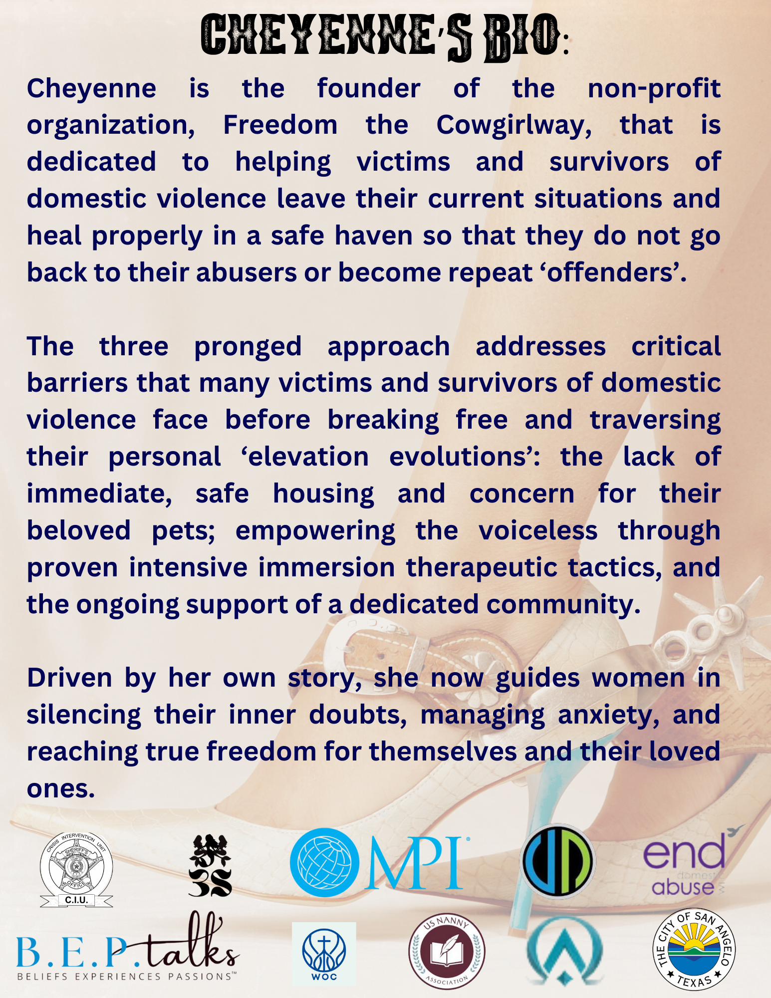 Cheyenne's narrative stems from a deeply personal place; her experience as a survivor of domestic violence and the relentless pursuit of breaking this cycle for her children. She shares her multifaceted moment of clarity-an ongoing process of growth, or as she puts it, an "elevation evolution." Cheyenne's unique approach-speaking barefoot for grounding, employing her Southern charm laced with a colorful vocabulary, and using real-life examples from volunteers in the crowd-makes her speeches memorable and impactful.