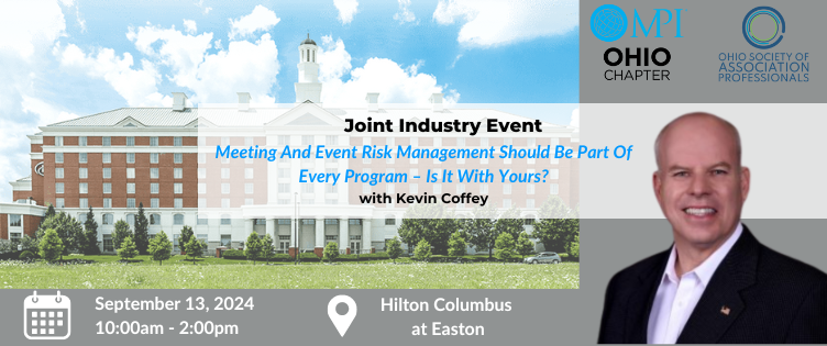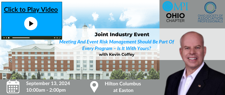 | MPI OHIO and OSAP are pleased to present the 2024 Joint Industry Event, an engaging and enlightening experience that combines the trends of travel and tourism with risk reduction and response presentations for the travel, meeting, and hospitality industries. | During our morning session, expert panelists will delve into the ever-evolving landscape of travel and tourism, sharing insights on trends, challenges, and best practices when engaging with one another during the planning process.| Following the morning session, prepare to be inspired by our luncheon keynote speaker, Kevin Coffey internationally known safety expert. | | Most meetings take place without incident ... but it just takes one to turn next event upside down. Technology failure, theft, facility evacuation, medical emergency and violence are just some incidents that could significantly impact not just your attendees, clients and customers, but your organization's reputation, as well. Discover "reasonable" easy-to-implement steps to help better prepare for "foreseeable" incidents and learn ways to incorporate meeting and event risk management into RFPs, pre-sales calls and site inspections, all designed to help you land more business and make your organization stand out from others in the competitive and crowded meeting marketplace. |