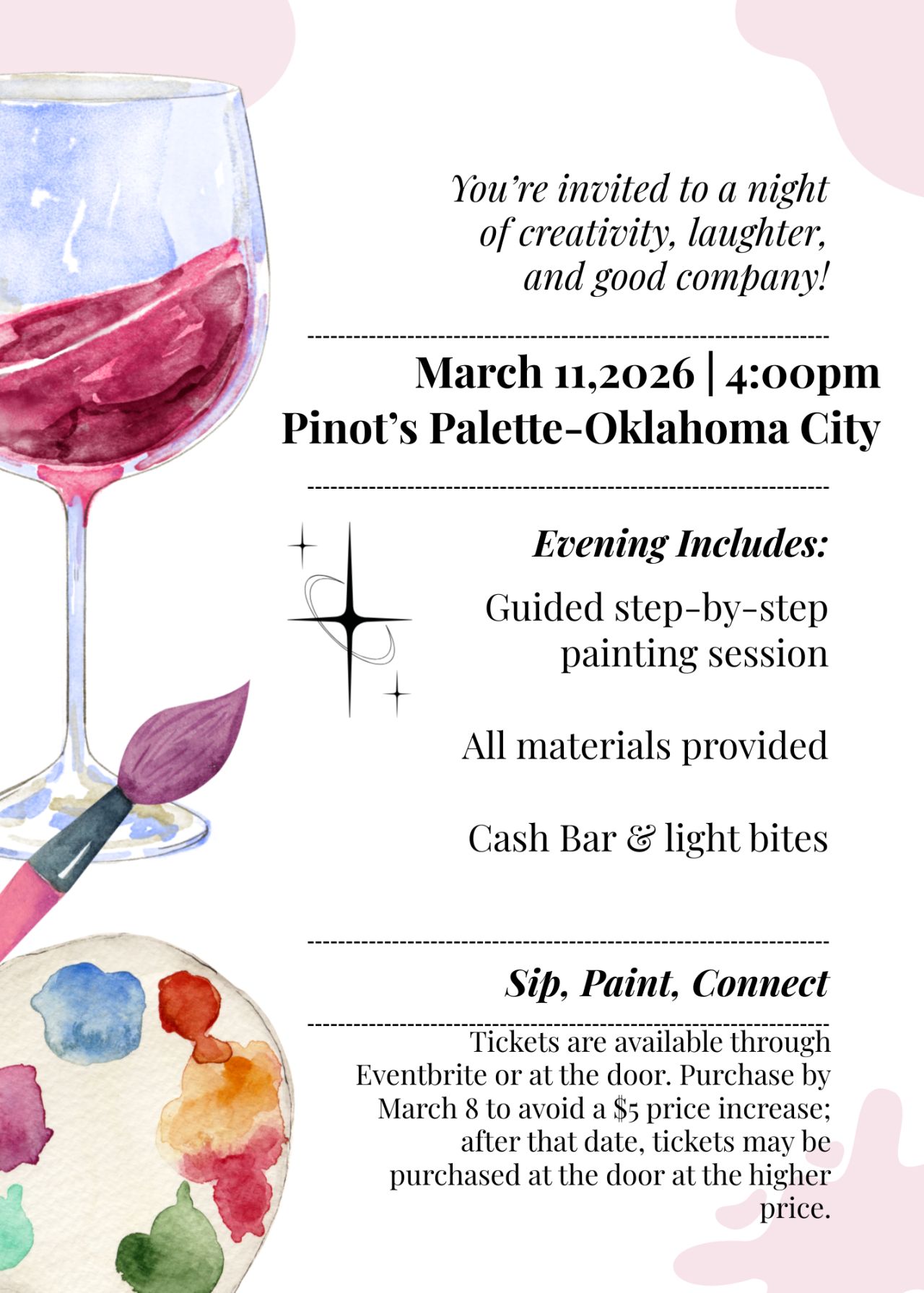 Join MPIOK for a creative and relaxing evening at Pinot's Palette in Bricktown! Unwind with friends and colleagues as you sip, snack, and let your inner artist shine.