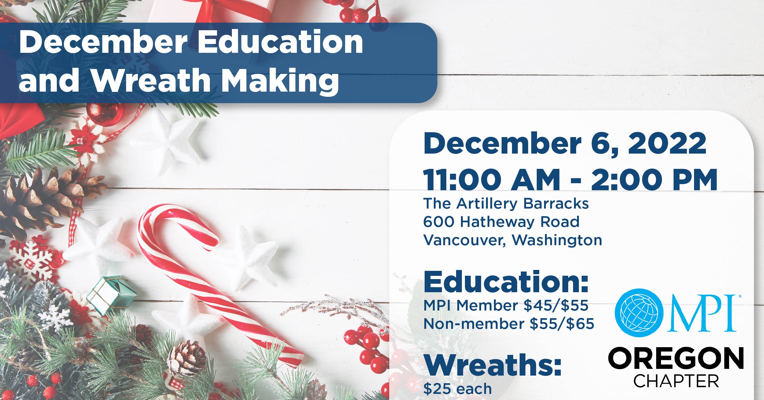 Skip the extra trip to the store and bring home a decorated wreath from MPI Oregon's December Education event! We will have a table set up with decorations if you want something a bit more festive, but all wreaths will be fresh and come with a small decoration already on there to get you in the holiday spirit.