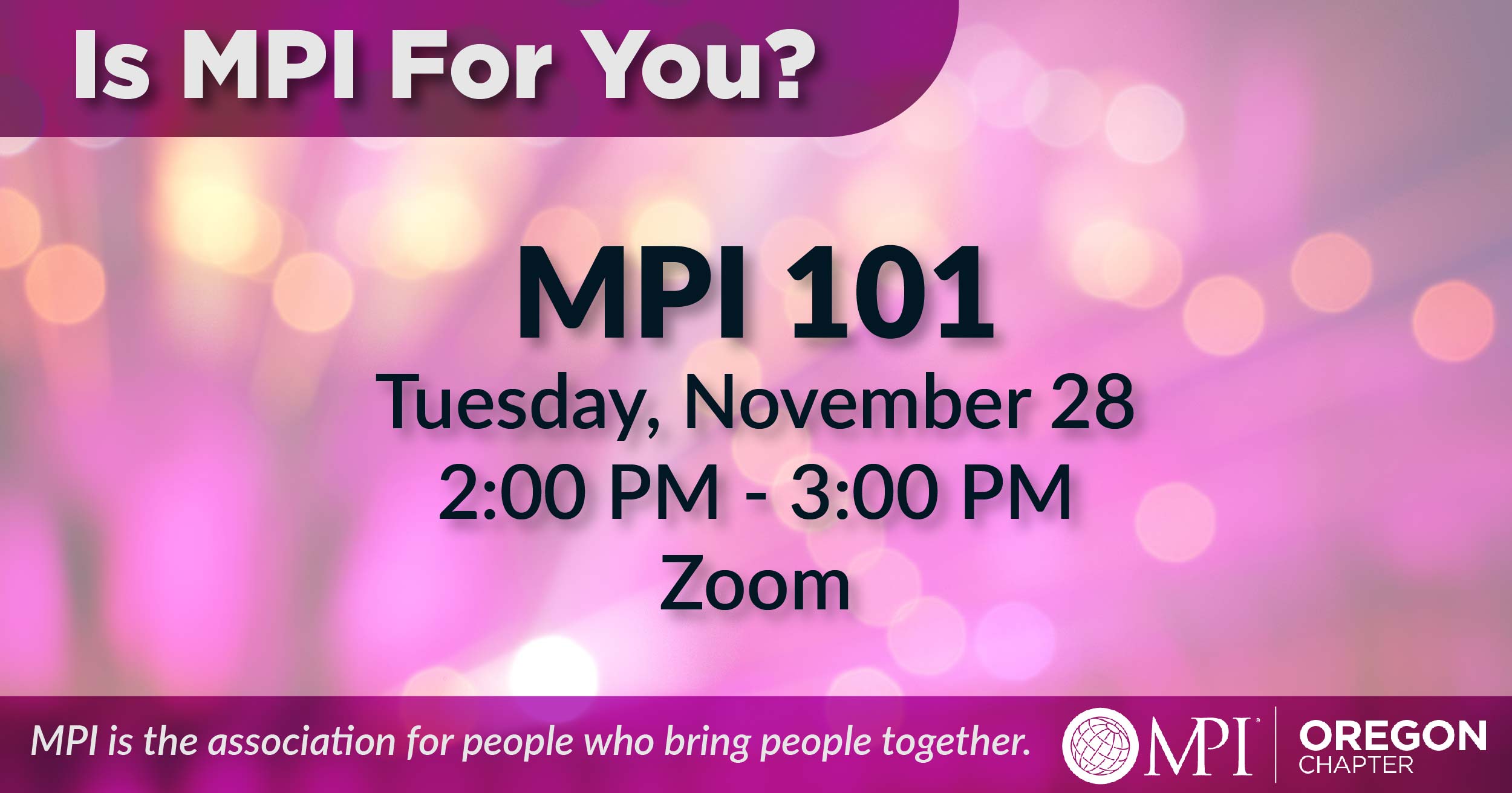 Are you a new member of MPI, thinking about joining or trying to convince your boss to let you join? Then, register for MPI 101! During this interactive presentation, you will learn about all the amazing benefits that MPI has to offer you as both a supplier and a planner, get to know other new or prospective members, and meet the membership team. Plus, you'll get a look around the website on where to find all this information.