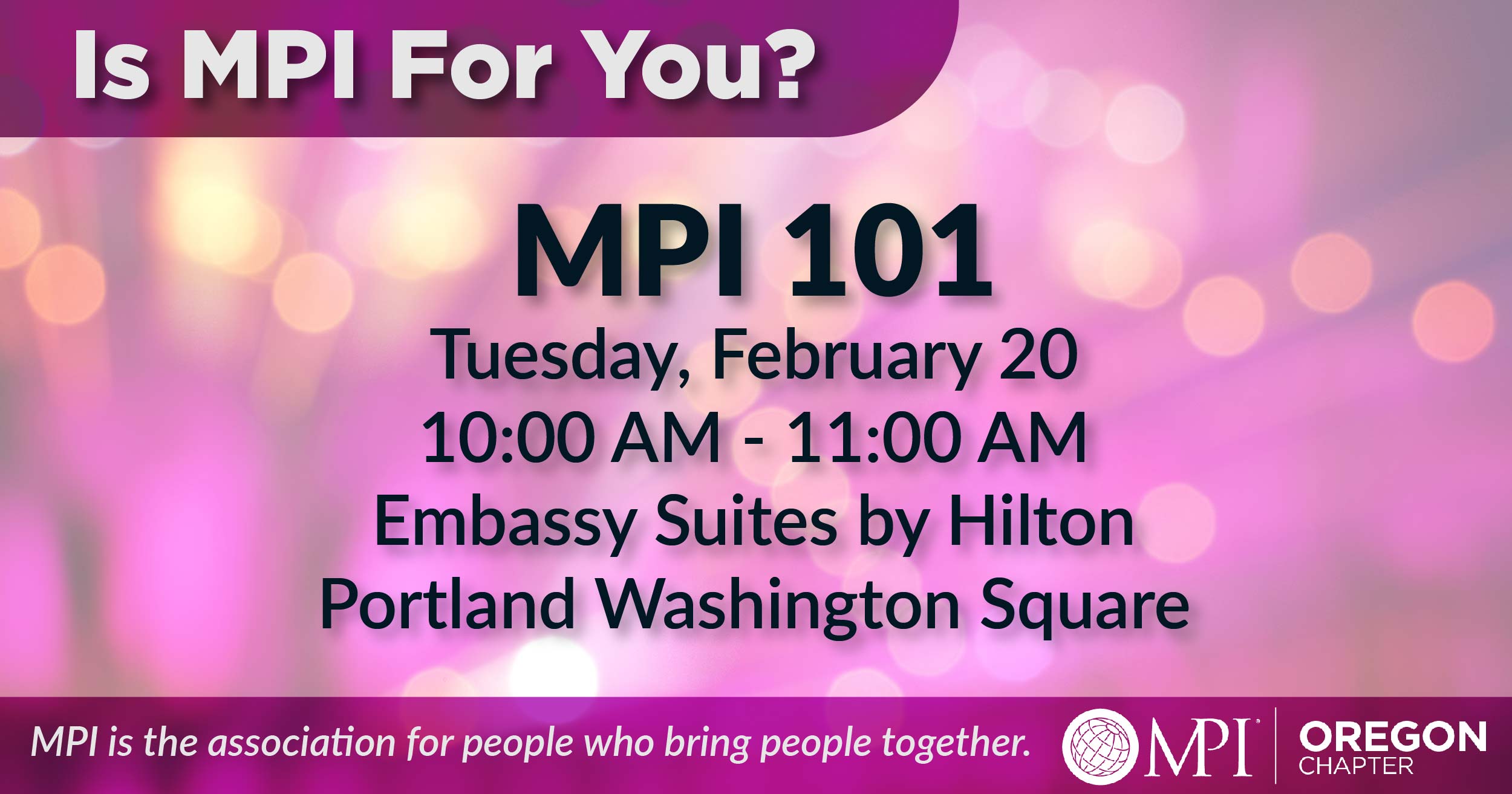 Are you a new member of MPI, thinking about joining or trying to convince your boss to let you join? Then, register for MPI 101! During this interactive presentation, you will learn about all the amazing benefits that MPI has to offer you as both a supplier and a planner, get to know other new or prospective members, and meet the membership team. Plus, you'll get a look around the website on where to find all this information.