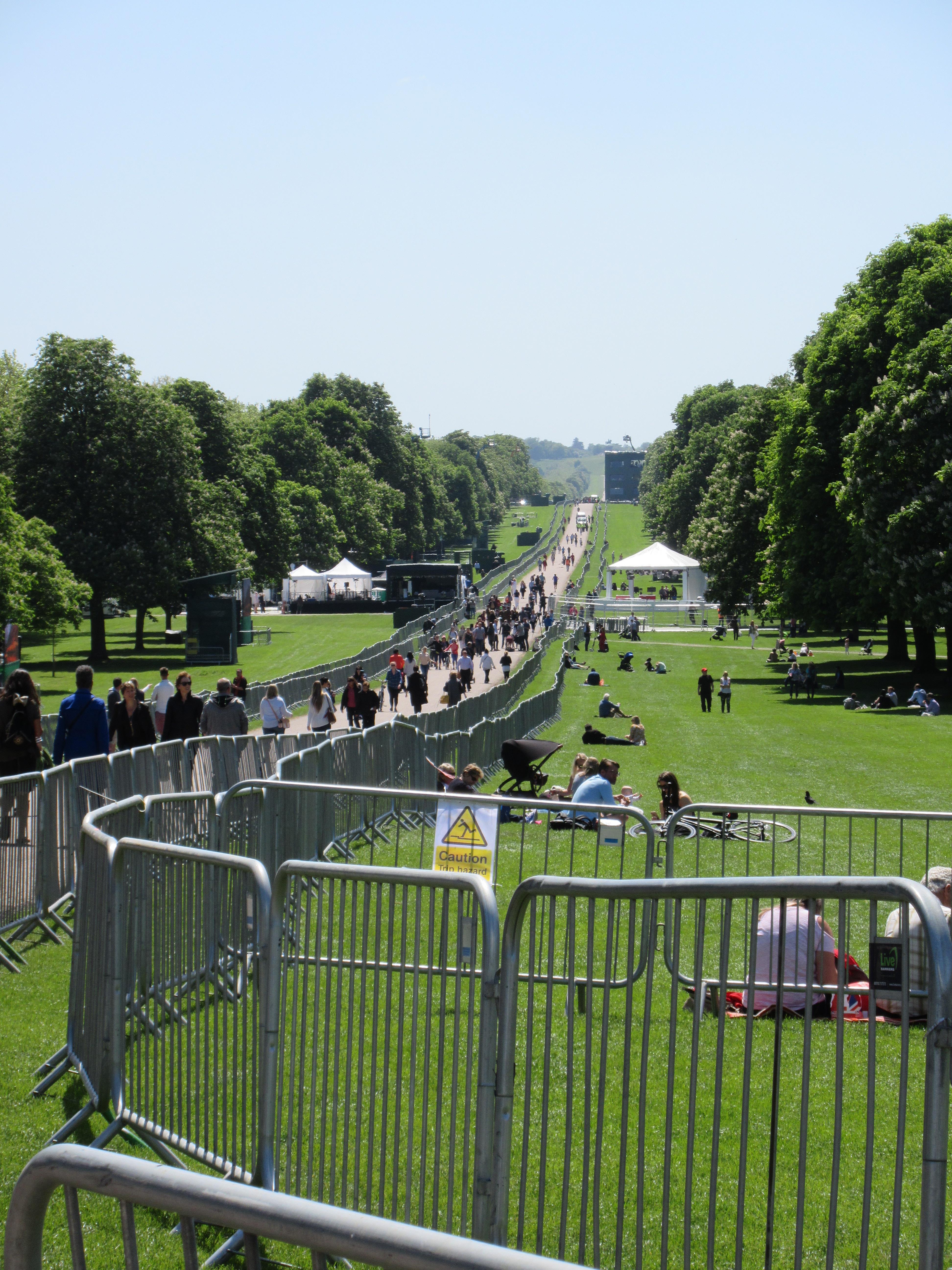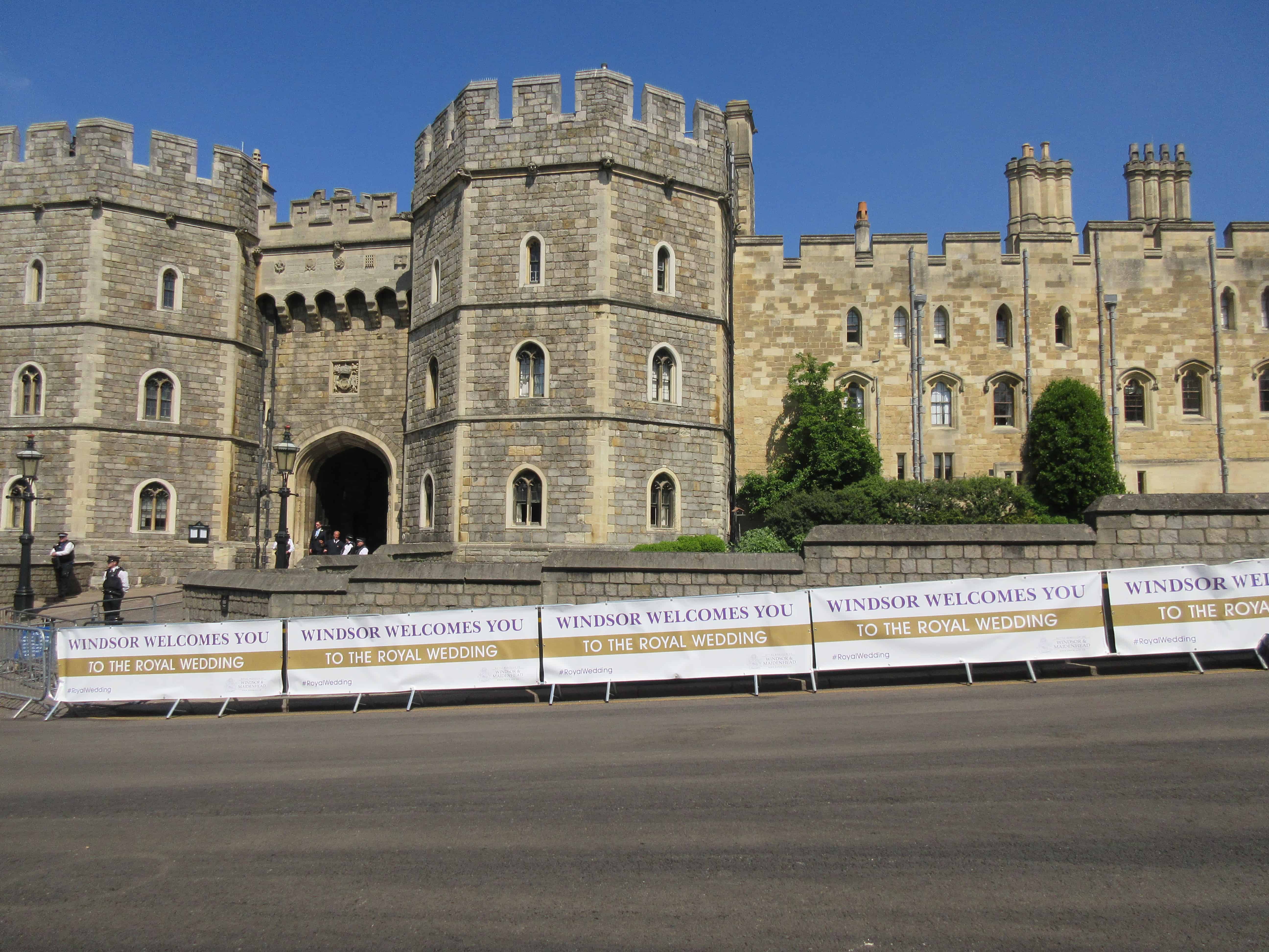 To scout the area, I headed on foot to Windsor Castle, about 20 blocks away. Everyone I met along the way was in a jolly mood. It was evident that the city was preparing for the expected descent of 100,000 visitors. I continued up the Long Walk, the tree-lined avenue leading to Windsor Castle. The lawns were perfectly groomed and crowd fencing had been installed; there were various food trucks set up, along with many portable lavatories. I thought that a position along the Long Walk might be a good place for the big day.