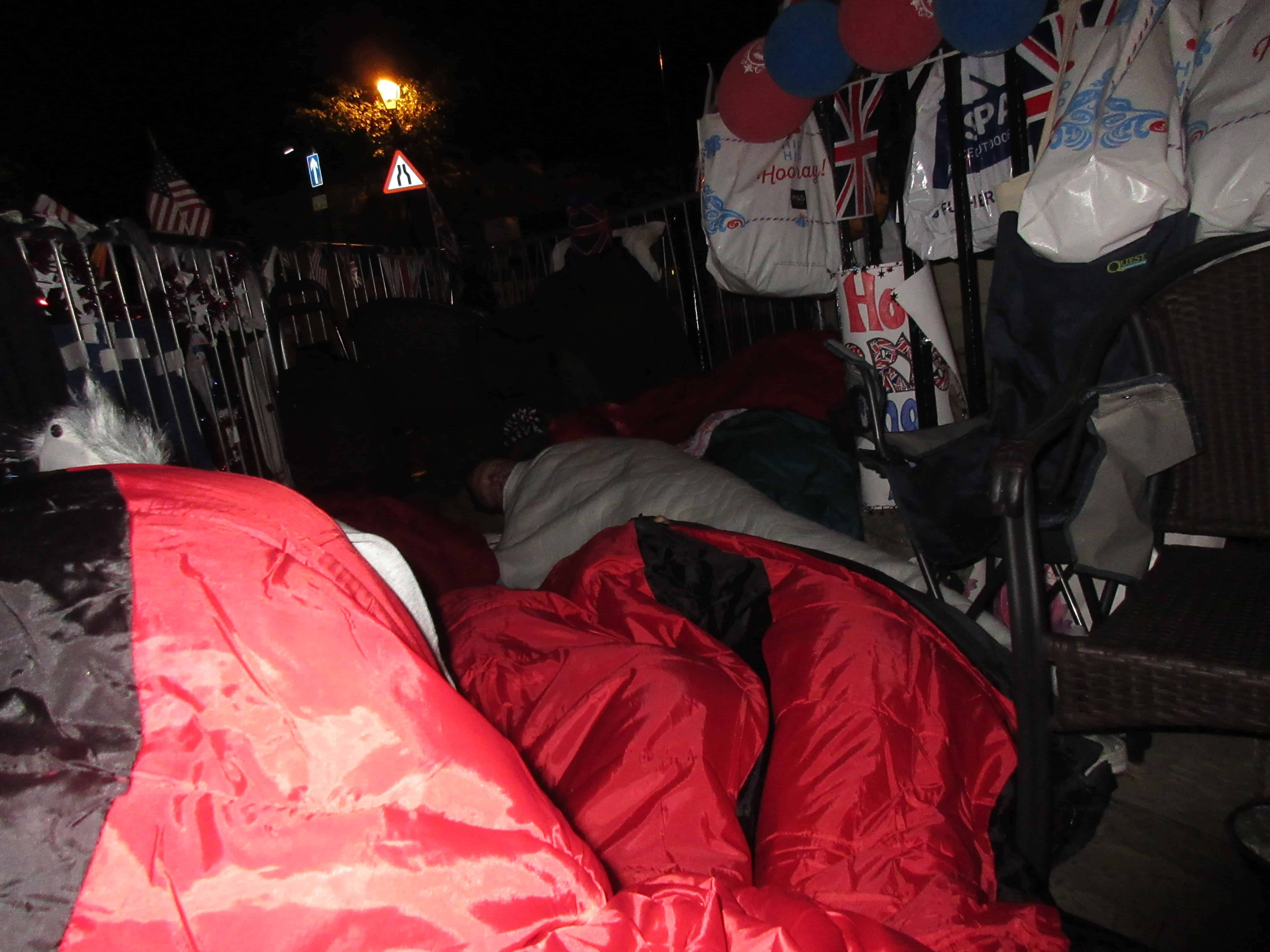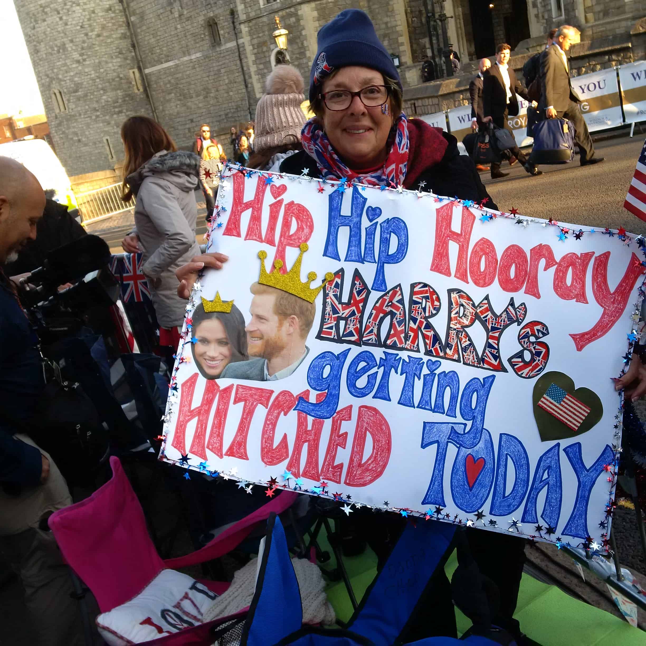 At about 100 feet from the visitor’s entrance to Windsor Castle, our camp was the closest possible public location to where Prince Harry and Markle’s carriage would exit following the wedding. Furthermore, our camp was just in front of a building rented by ABC and CBS as their broadcasting headquarters, with numerous cameramen stationed on the roof. The networks tried to get us to move, but we held our ground. We even made friends with the building’s security guard, who allowed us to use the bathroom inside. We made sure he was supplied with ample coffee, chocolate, etc.