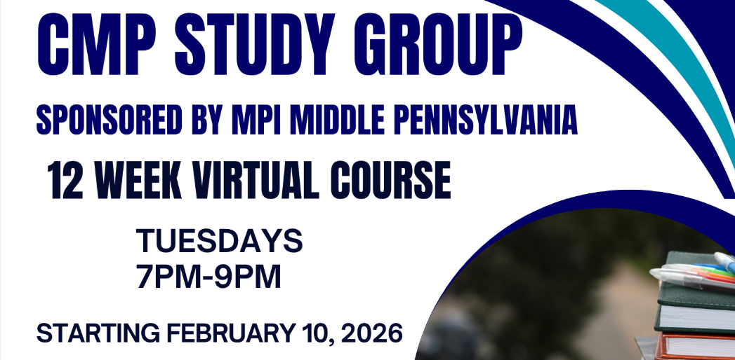 A 12‑Week Virtual CMP Study Group will begin on Tuesday, February 10, with sessions held every Tuesday from 7–9 PM. Each week will focus on one of the newly updated 12 domain areas, providing a structured and comprehensive approach to exam preparation—all in an online format.