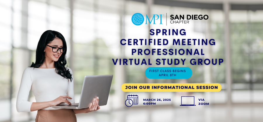 MPI San Diego will host a free virtual informational meeting on Wednesday, March 26th @ 6pm. Learn about the Event Industry Council's (EIC) application process, review study options and connect with other meeting professionals.