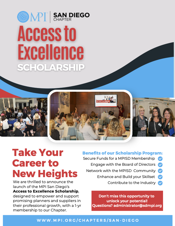 Calling all meeting and event professionals! We are thrilled to announce the launch of the MPI San Diego’s Access to Excellence Scholarship, designed to empower and support promising planners and suppliers in their professional growth. This scholarship provides a fantastic opportunity for eligible candidates to secure funds for an MPI San Diego membership. If you're a planner or supplier, passionate about making a significant impact in the industry and ready to take your career to new heights, we encourage you to apply!
