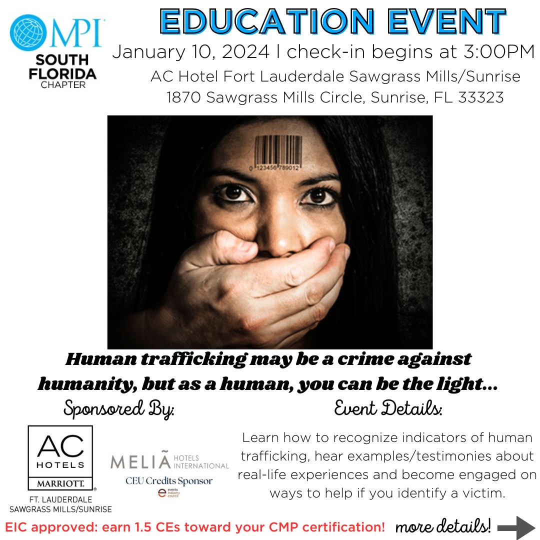 Learn how to recognize indicators of human trafficking, hear examples/testimonies about real-life experiences and become more engaged on ways to help if you identify a victim.