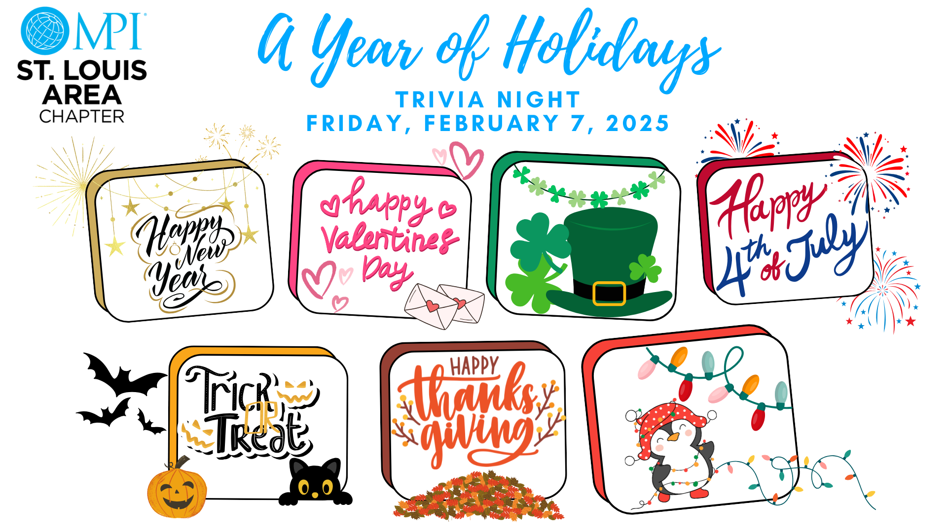 Put your holiday knowledge to the test at MPI St. Louis' Annual Trivia Night! This festive trivia event will test your knowledge of holidays across the calendar, from New Year's Eve to Halloween, and everything in between. Whether you're a holiday history expert, a fan of seasonal traditions, or simply love a good trivia challenge, there's something for everyone! The evening includes a cash bar, heavy hor d'oeuvres provided by The Franklin of Soulard, a complementary signature cocktail, 50/50 raffle, and a silent auction!