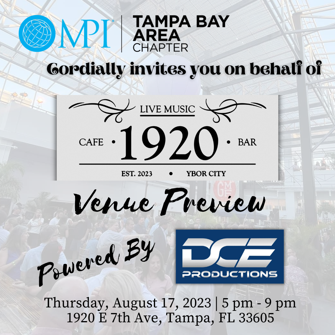 MPI Tampa Bay invites you on behalf of DCE Productions & 1920 Ybor, your vibrant new destination for thrilling live music, immersive art, captivating entertainment, and unforgettable dining in the heart of historic Ybor City. Nestled amidst the cobblestone streets and vibrant energy of Tampa's cultural hub, our venue (formally Frankie's Patio) is a loving homage to Ybor's rich heritage, fusing the timeless elegance of that era with a contemporary flair.