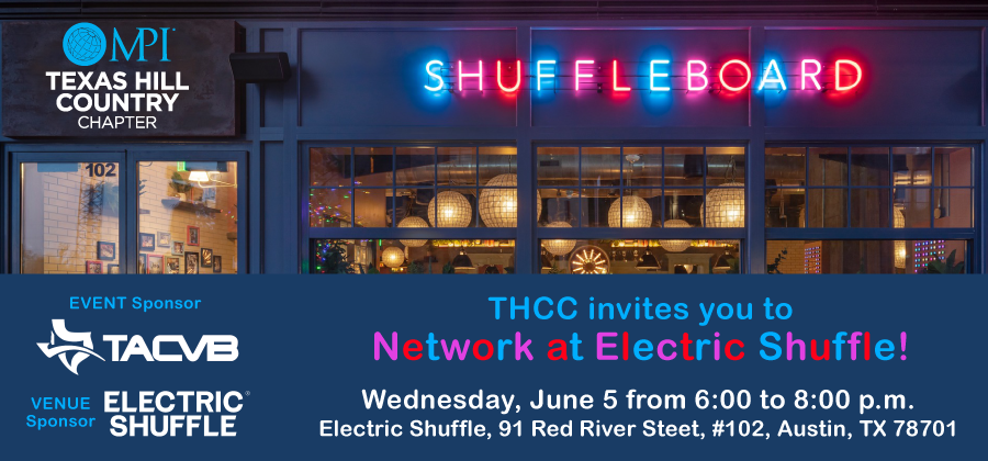 Cap off your afternoon with an engaging evening of networking and fun at Electric Shuffle! Hosted by the MPI Texas Hill Country Chapter and sponsored by TACVB, this event is a perfect opportunity to connect with fellow professionals from various Convention and Visitors Bureaus and Destination Management Organizations. Enjoy a casual atmosphere where you can relax, exchange ideas, and build lasting connections. Indulge in a craft cocktail and delicious hors d'oeuvres while playing a variety of high-tech shuffleboard games, thanks to our generous venue sponsor, Electric Shuffle.