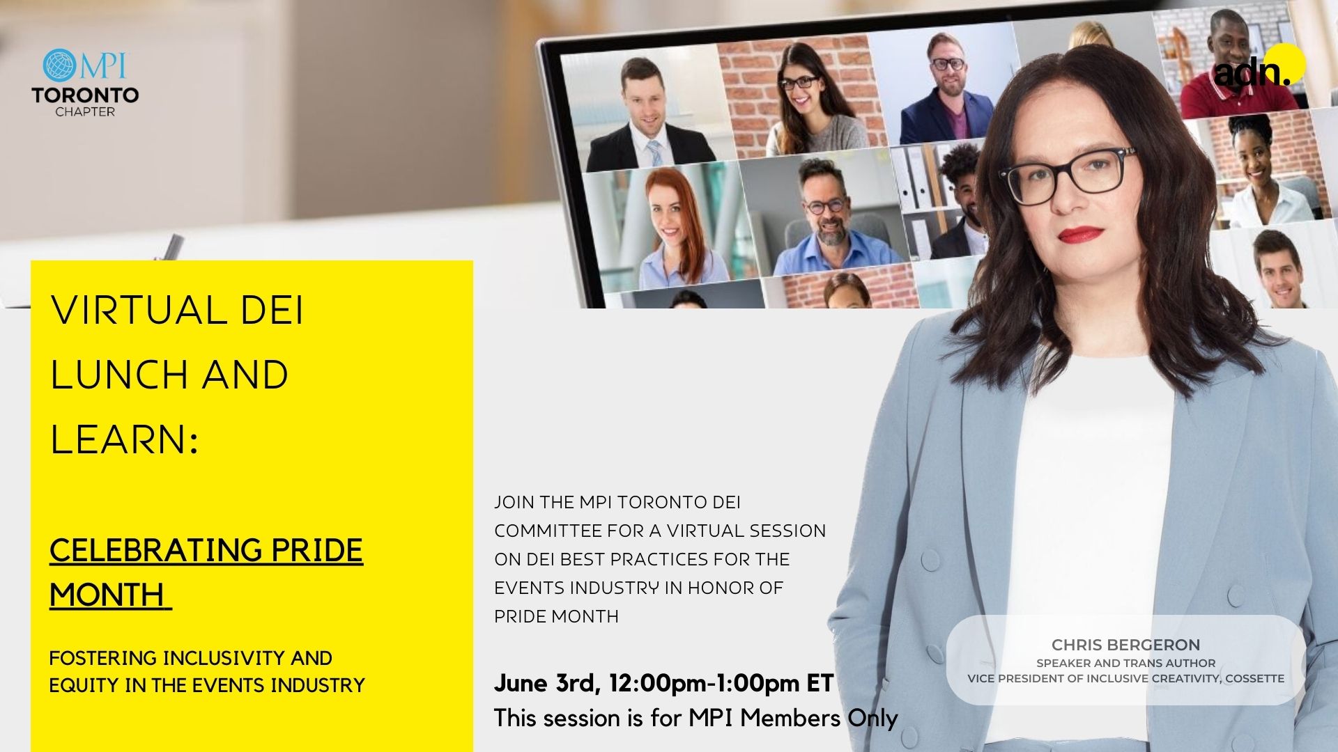 Join us for an enriching virtual DEI Lunch and Learn session celebrating Pride Month, a key component of the MPI Toronto Chapter and adn speakers DE&I event series. This gathering aims to educate, inspire, and foster meaningful conversations about the importance of women's rights and their impact on the meetings and events industry.