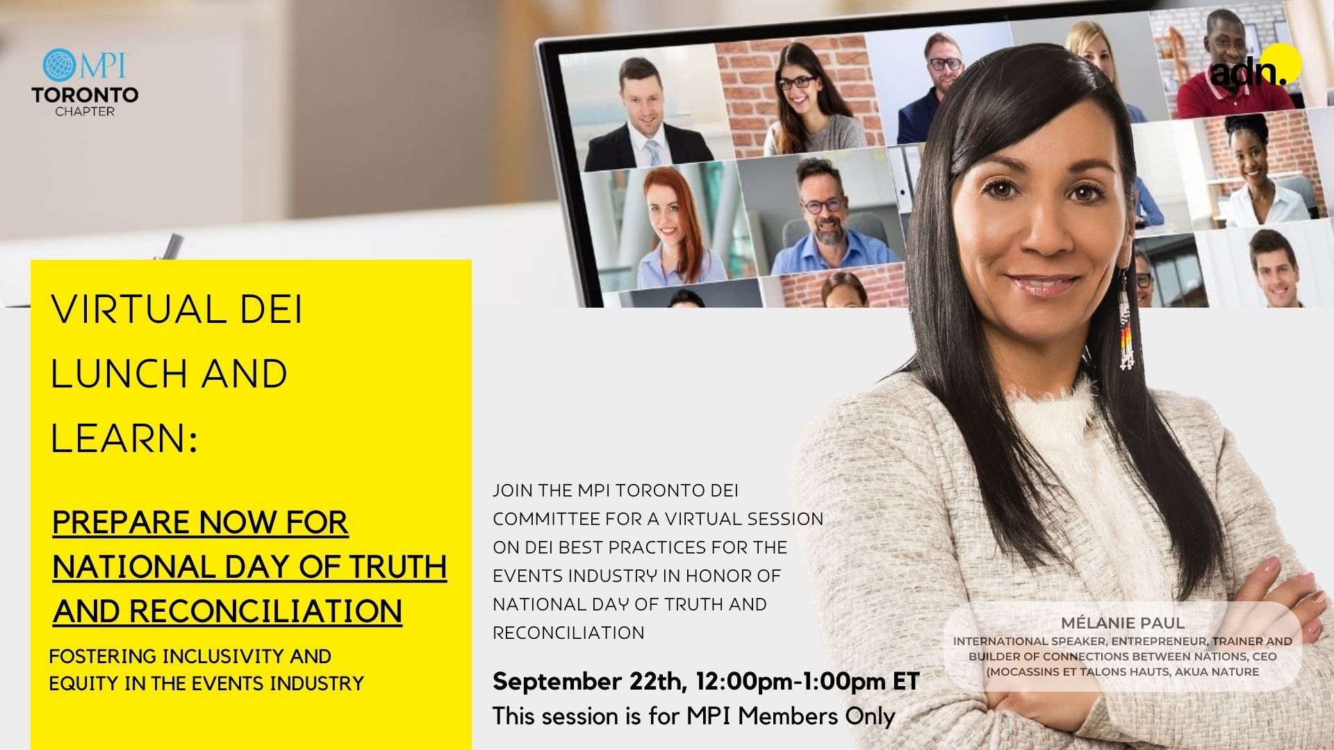 Join us for an enriching virtual DEI Lunch and Learn session commemorating the National Day of Truth and Reconciliation, a key component of the MPI Toronto and adn speakers DE&I event series. This gathering aims to educate, inspire, and foster meaningful conversations about Indigenous history, culture, and reconciliation within the meetings and events industry.