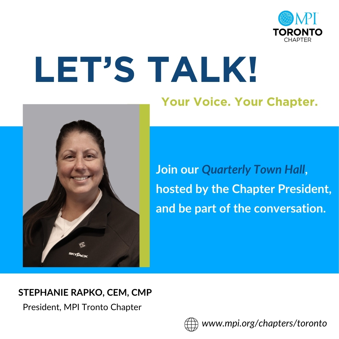 As part of the MPI Toronto Chapter’s 2026 theme of engagement, we will host quarterly one-hour virtual town halls at noon EST. These sessions will provide updates on Chapter, Canadian, and Global initiatives, while also creating an open forum for member questions and feedback. The goal is continuous improvement—and ensuring you’re getting the greatest possible value from your MPI membership.