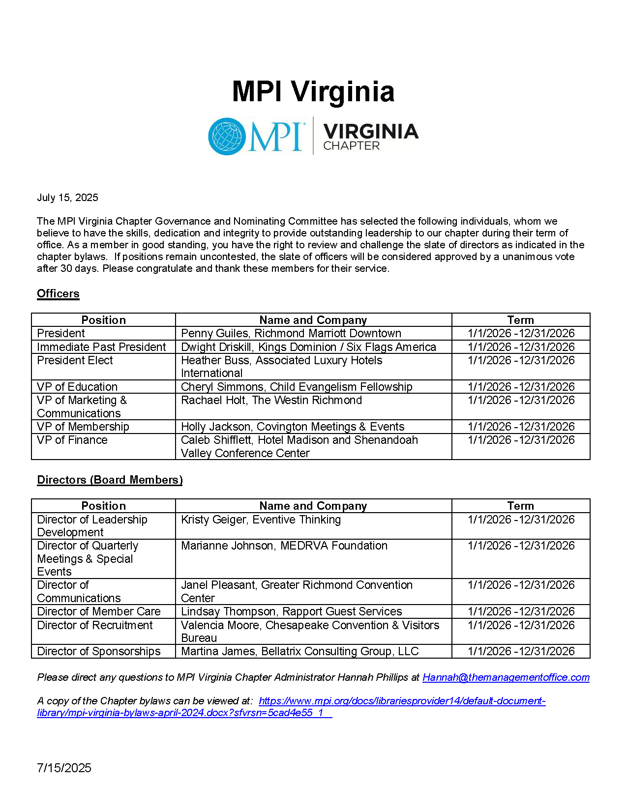 Are you interested in becoming a committee member or taking a leadership role? Contact one of MPI Virginia’s Board members or Committee Chairs with questions.
