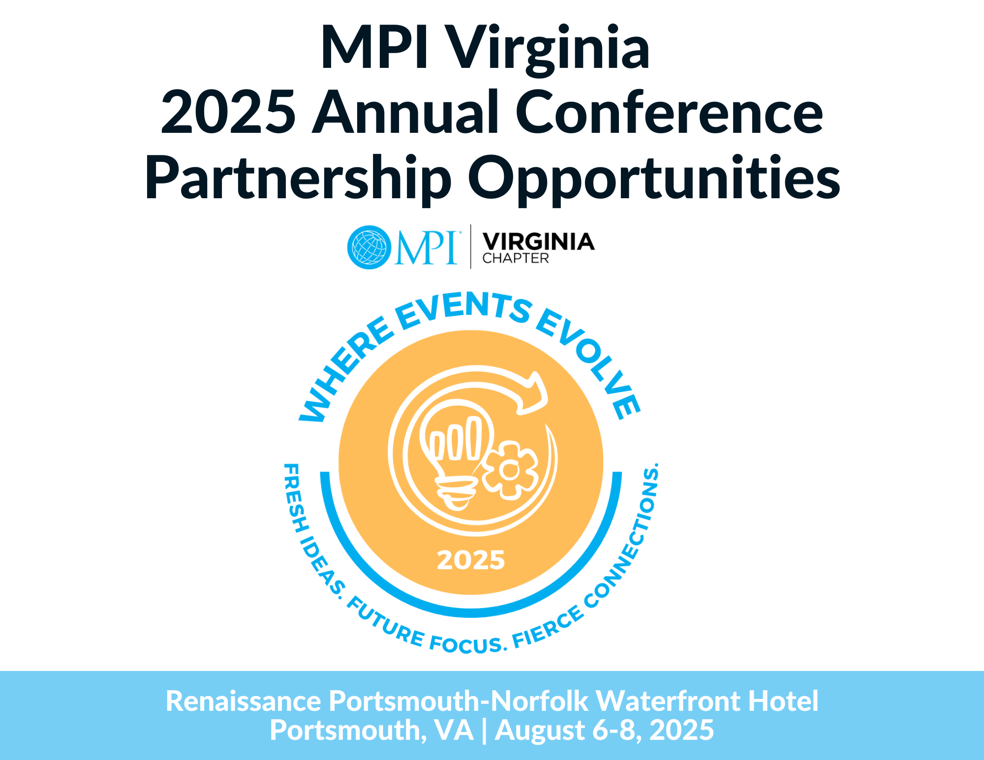 The highlight of the year for MPI Virginia is the Annual Conference. The 2025 Annual Conference will be held August 6-8 in Portsmouth, Virginia at the Renaissance Portsmouth-Norfolk Waterfront Hotel, and will provide numerous ways to market your business. Our sponsors receive networking opportunities including: video and web promotions, display tables, speaking time at the podium, and follow-up e-letter and e-blast opportunities. With a plan suited for every budget, you won't want to miss this exceptional value!